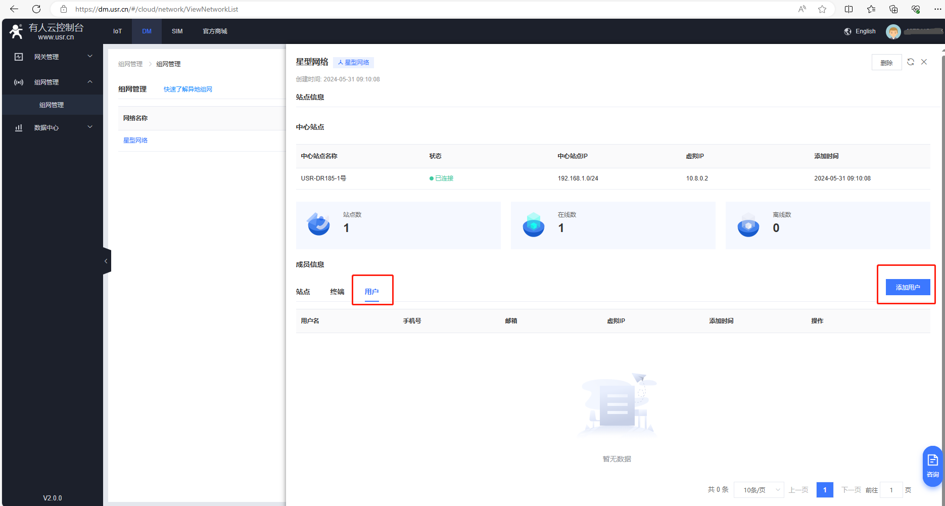 中心站點(diǎn)選擇USR-DR185-1號(hào),中心站點(diǎn)IP填192.168.1.0,點(diǎn)擊創(chuàng)建。