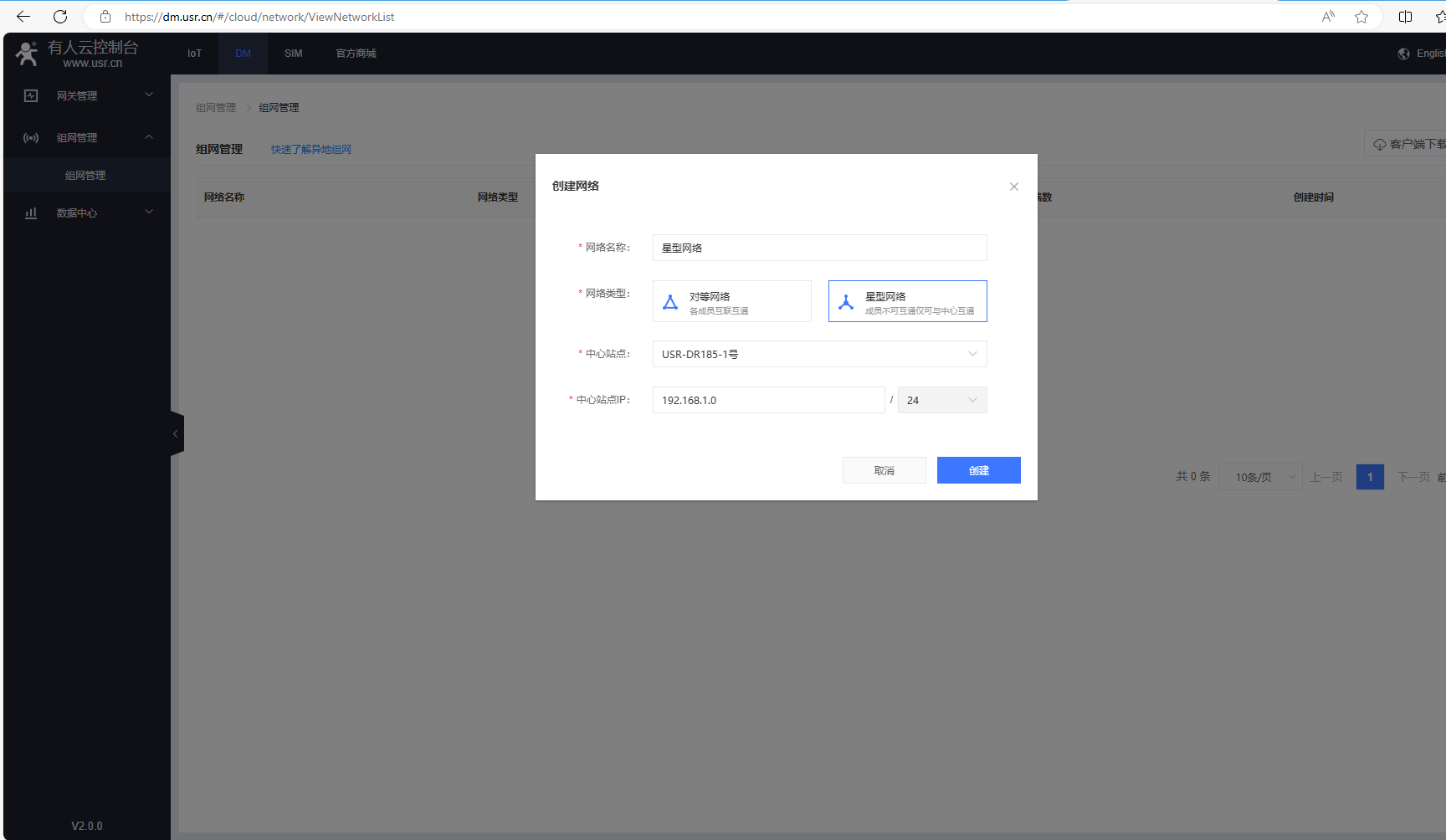 中心站點(diǎn)選擇USR-DR185-1號,中心站點(diǎn)IP填192.168.1.0,點(diǎn)擊創(chuàng)建。