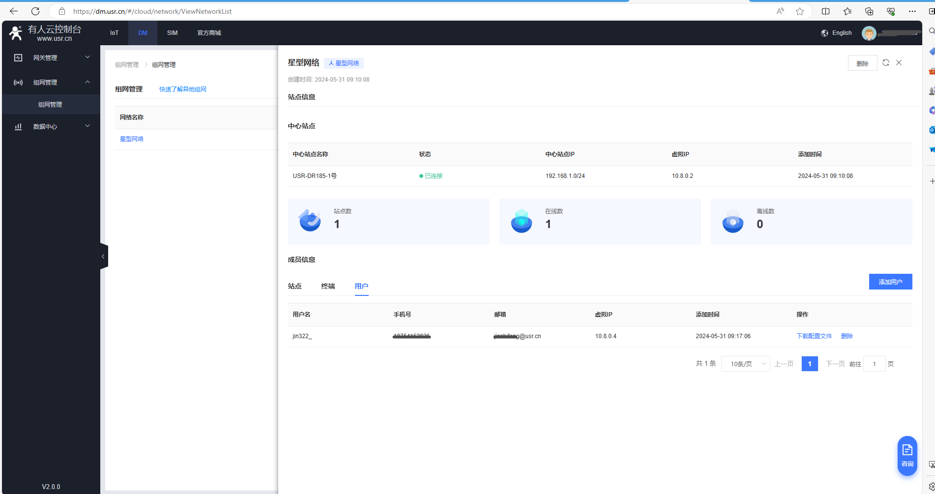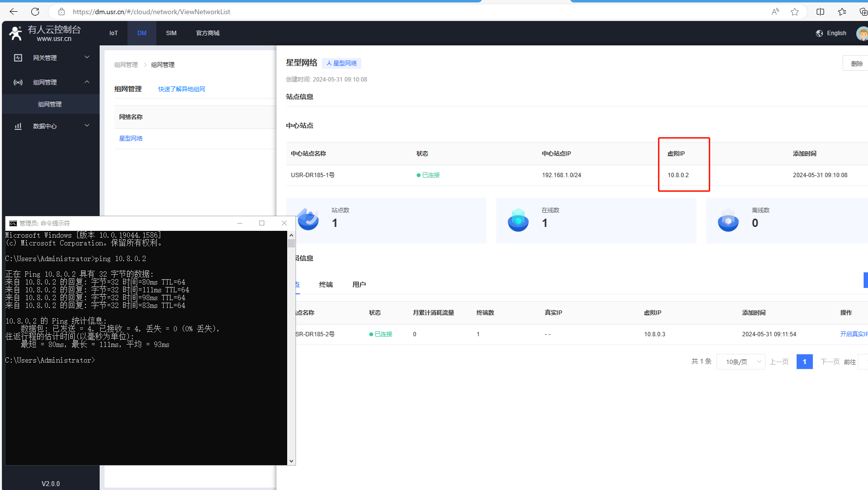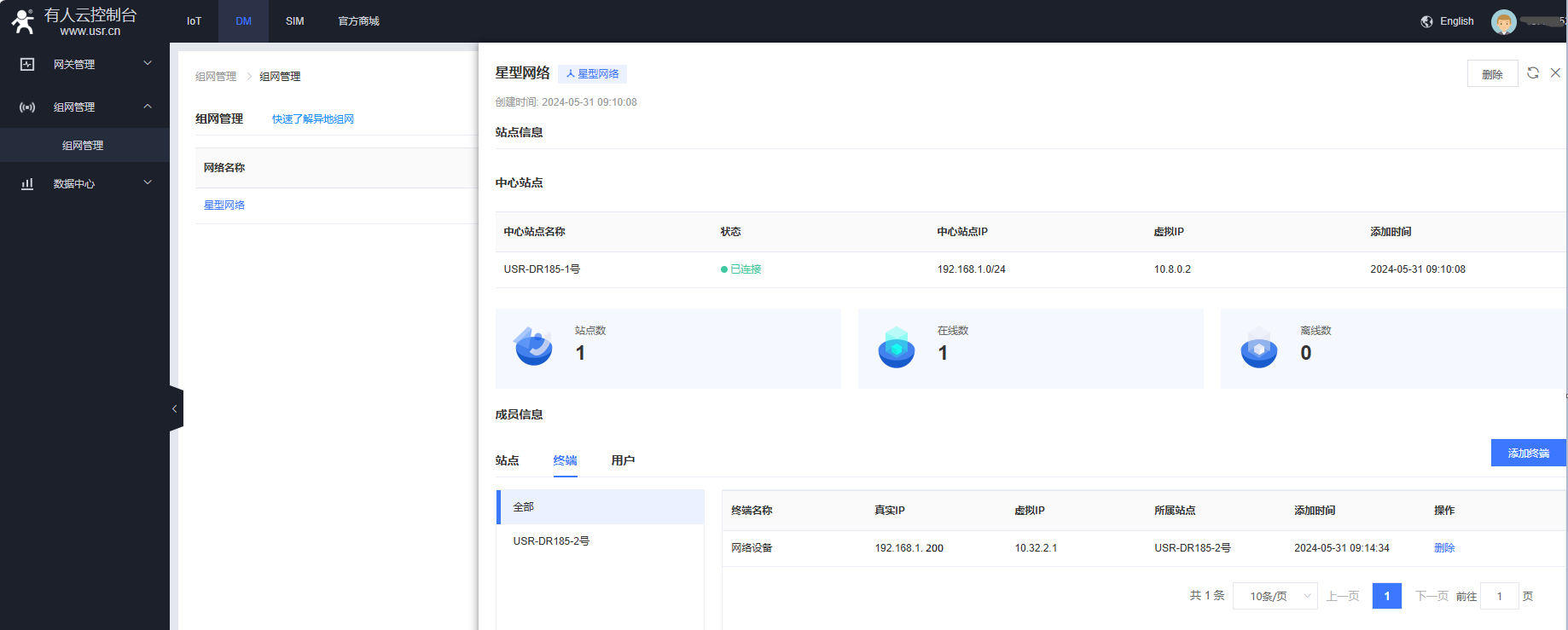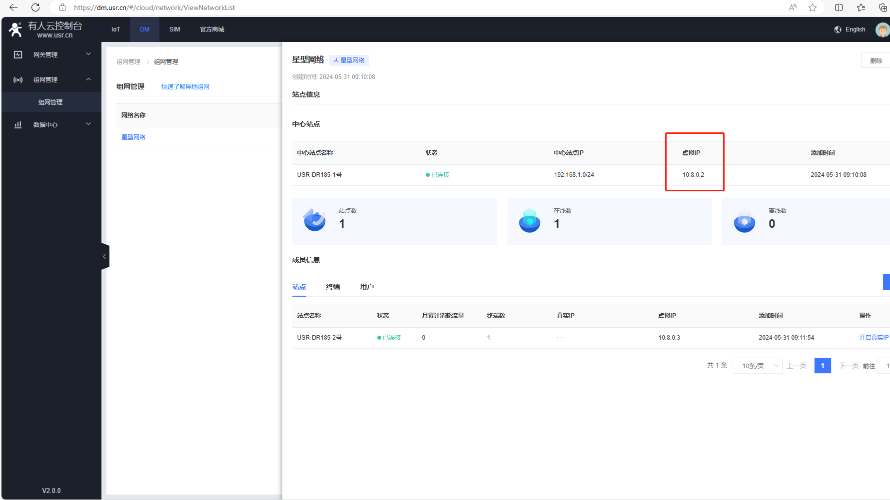 1、電腦登陸有人云DM平臺,點(diǎn)擊組網(wǎng)管理,點(diǎn)擊新建的星型網(wǎng)絡(luò),查看中心站點(diǎn)USR-DR185-1號的虛擬IP是10.8.0.2
