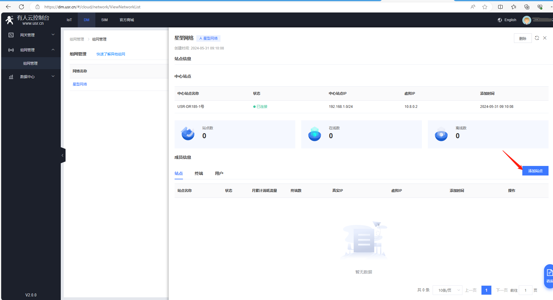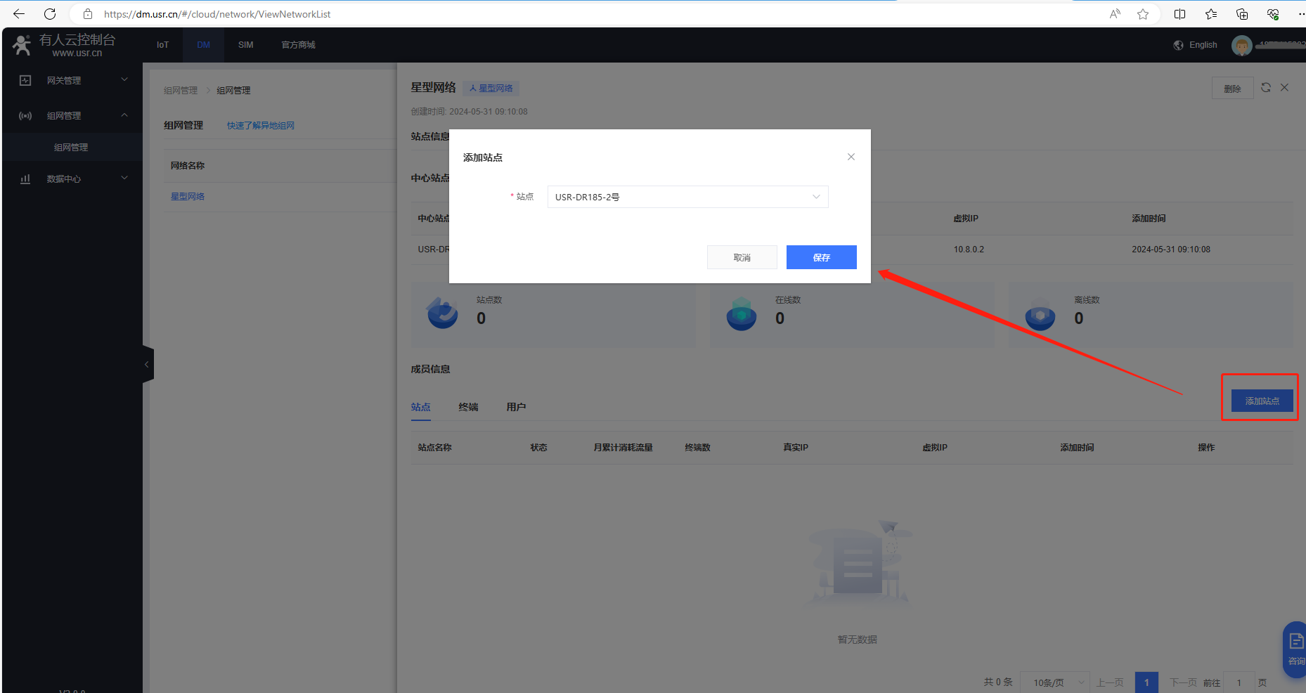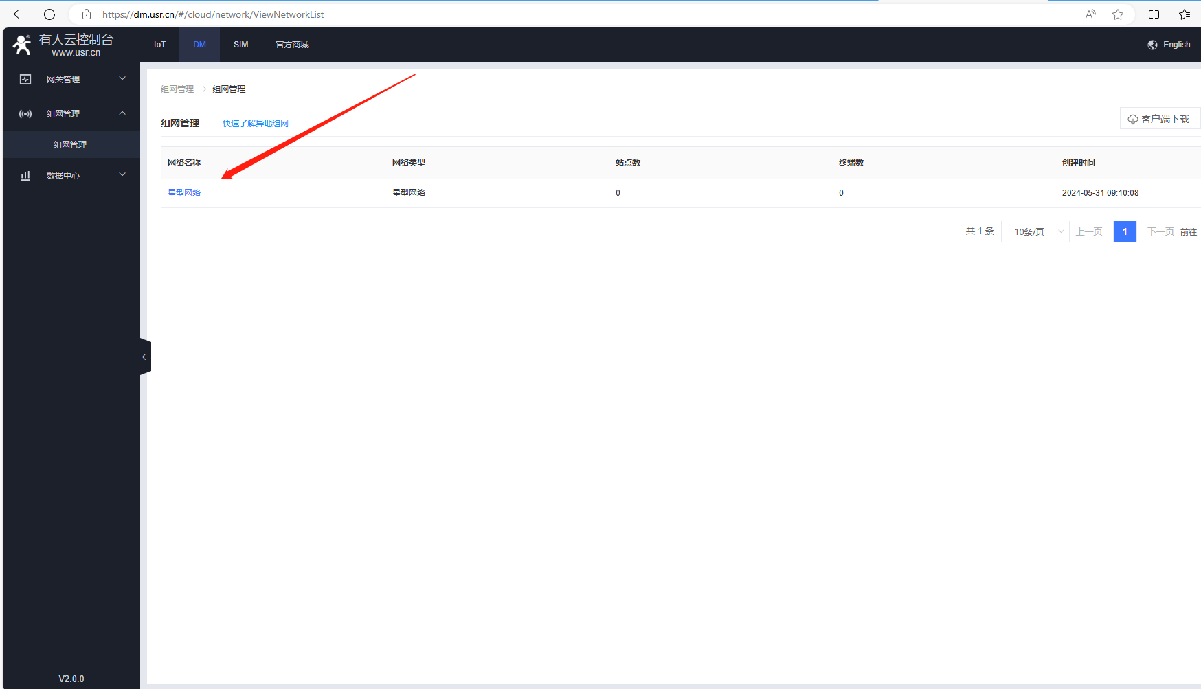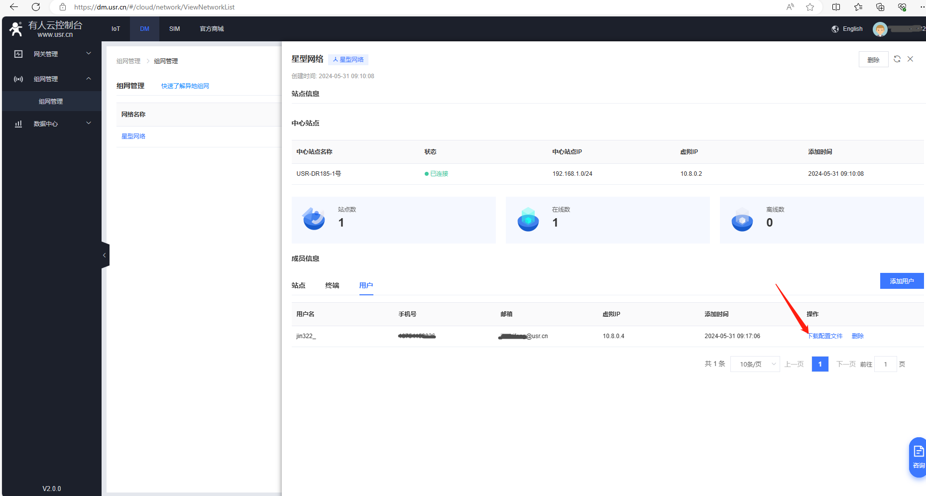 1、電腦登陸有人云DM平臺,點(diǎn)擊組網(wǎng)管理,點(diǎn)擊新建的星型網(wǎng)絡(luò),查看中心站點(diǎn)USR-DR185-1號的虛擬IP是10.8.0.2