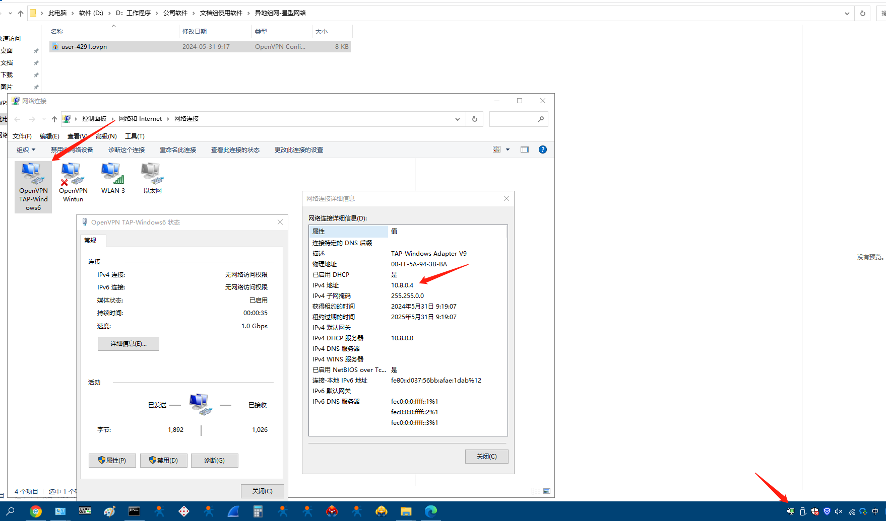 (4)電腦控制面板,查看網(wǎng)絡(luò)連接,OpenVPN TAP-Windows6網(wǎng)卡,查看IPv4的IP是10.8.0.4