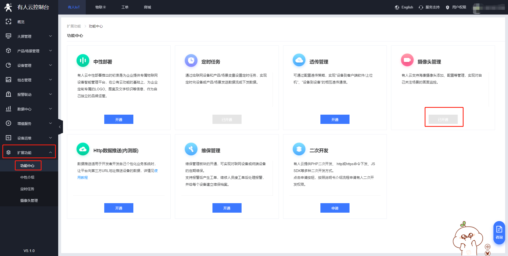 3、在擴(kuò)展功能---功能中心將攝像頭管理開通,左側(cè)列表生成該項(xiàng)欄,點(diǎn)擊進(jìn)入攝像頭管理