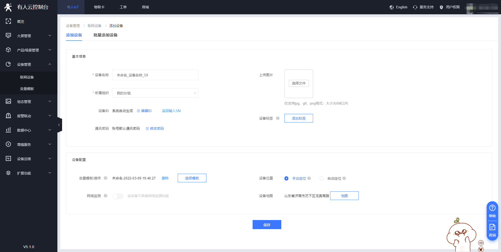 1、登錄云平臺后,在設(shè)備管理---聯(lián)網(wǎng)設(shè)備---添加設(shè)備