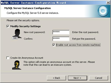 這一步詢問是否要修改默認root用戶(超級管理)的密碼(默認為空),“New root password”如果要修改,就在此填入新密碼(如果是重裝,并且之前已經(jīng)設(shè)置了密碼,在這里更改密碼可能會出錯,請留空,并將“Modify Security Settings”前面的勾去掉,安裝配置完成后另行修改密碼),“Confirm(再輸一遍)”內(nèi)再填一次,防止輸錯。 “Enable root access from remote machines(是否允許root用戶在其它的機器上登陸,如果要安全,就不要勾上,如果要方便,就勾上它)”。最后“Create An Anonymous Account(新建一個匿名用戶,匿名用戶可以連接數(shù)據(jù)庫,不能操作數(shù)據(jù),包括查詢)”,一般就不用勾了,設(shè)置完畢,按“Next”繼續(xù)。
