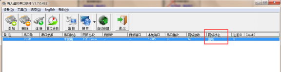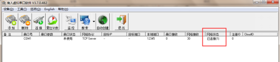 如使用一個GPRS DTU建立連接時會在網(wǎng)絡(luò)狀態(tài)上顯示已連接(1)。網(wǎng)絡(luò)狀態(tài)如果一直顯示監(jiān)聽狀態(tài),請檢查之前設(shè)置參數(shù)是否有誤,