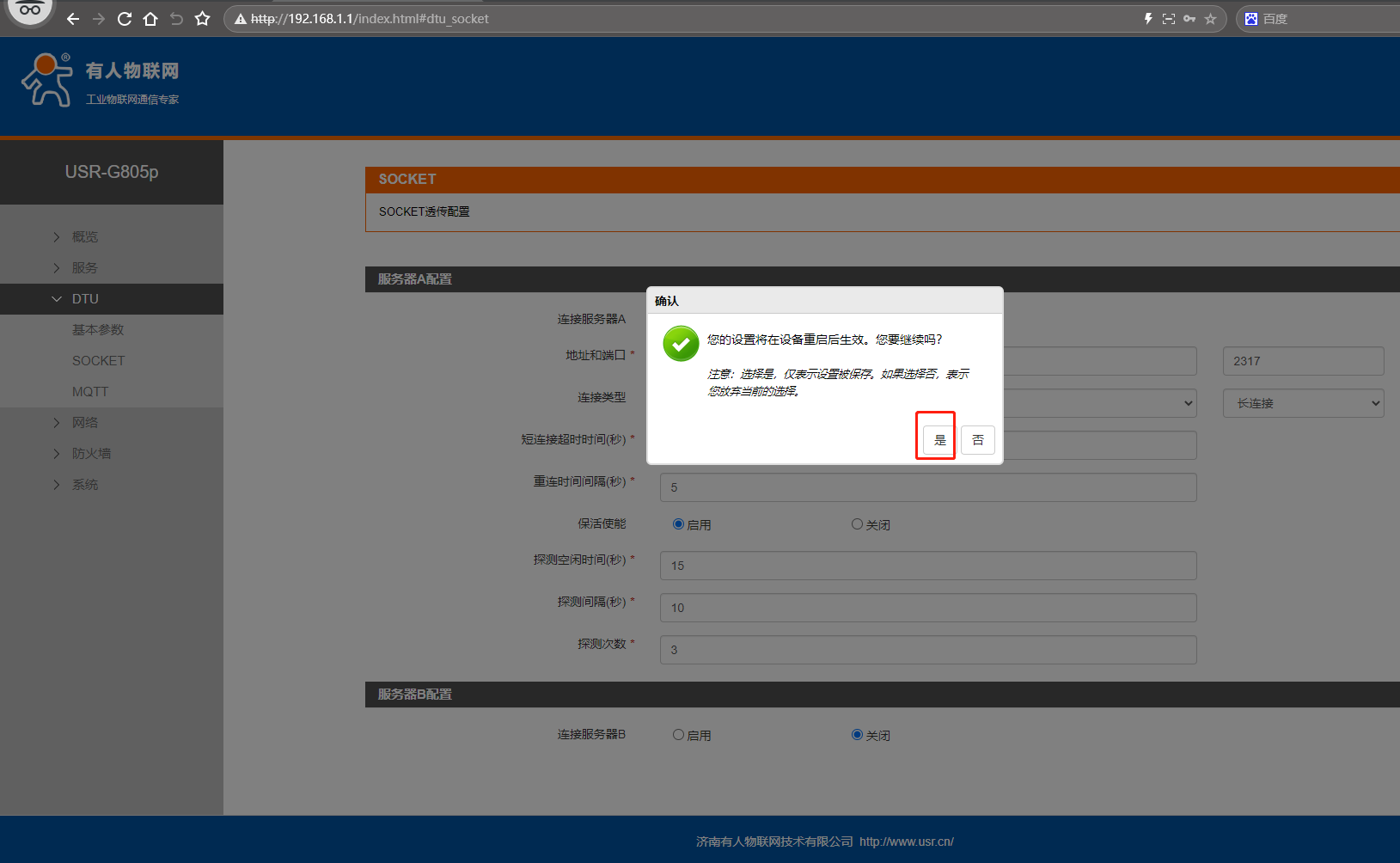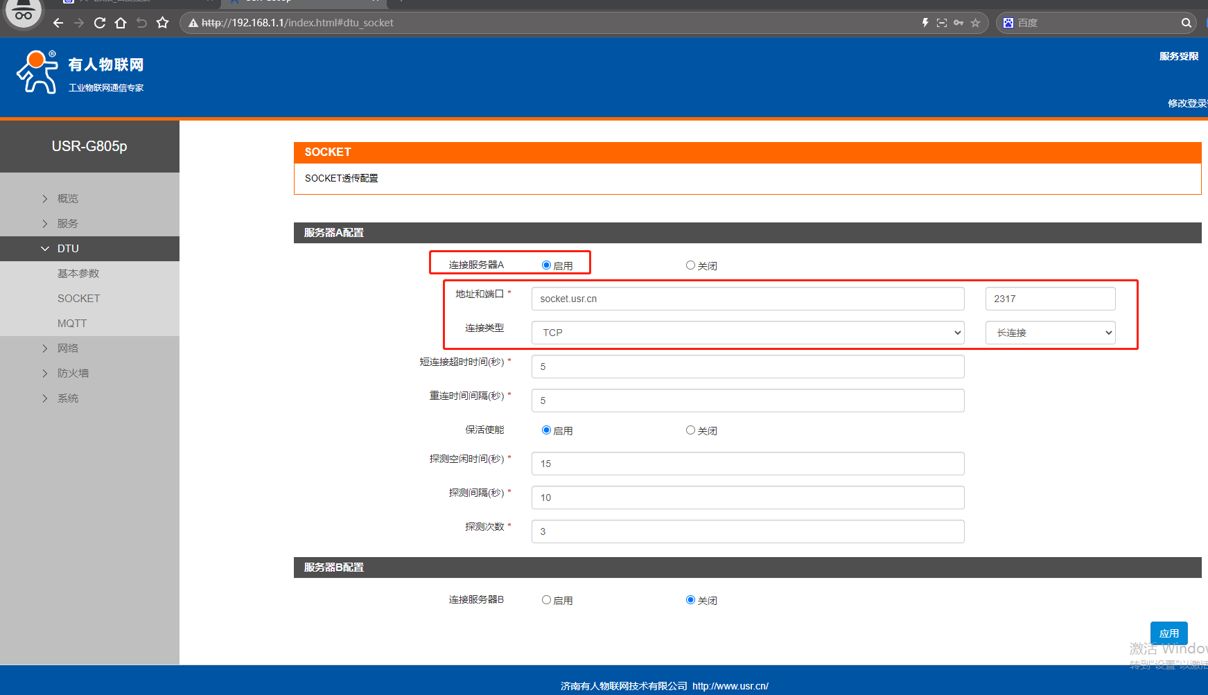 網(wǎng)頁(yè)點(diǎn)擊DTU,點(diǎn)擊SOCKET,連接服務(wù)器A,點(diǎn)擊啟用,地址填有人公司測(cè)試服務(wù)器socket.usr.cn,端口號(hào)2317,連接類(lèi)型TCP,長(zhǎng)連接。點(diǎn)擊應(yīng)用。
