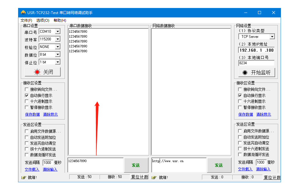 1、打開(kāi)串口助手,選擇USB-RS485串口線的COM口號(hào),串口參數(shù)和USR-G805p一致。測(cè)試串口向有人測(cè)試服務(wù)器發(fā)送數(shù)據(jù),有人測(cè)試服務(wù)器向串口返回同樣數(shù)據(jù)。證明產(chǎn)品聯(lián)網(wǎng)正常,串口通訊正常。