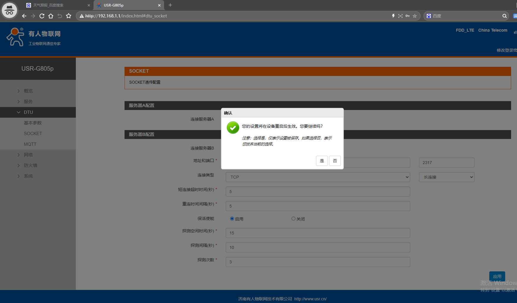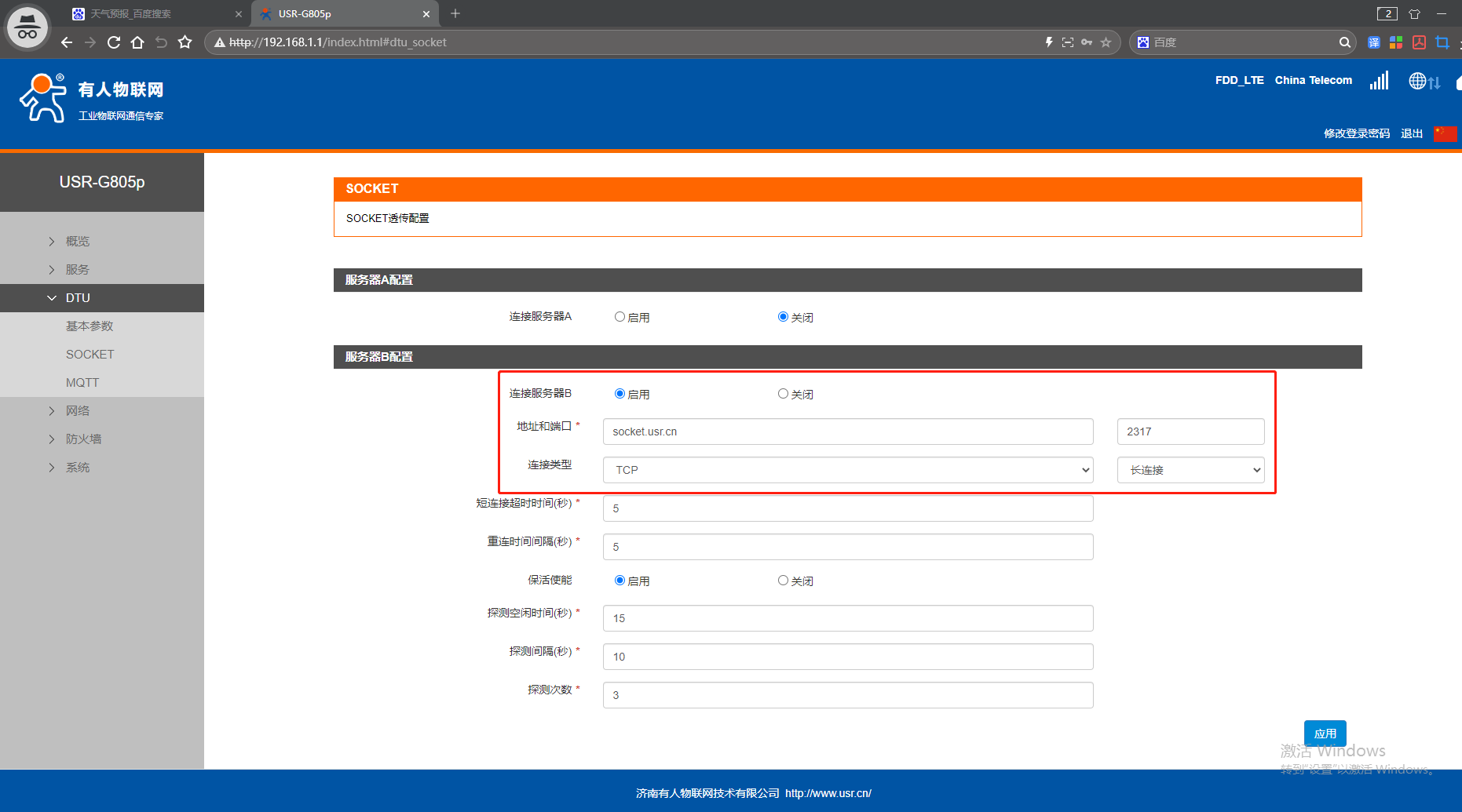 網(wǎng)頁(yè)點(diǎn)擊DTU,點(diǎn)擊SOCKET,連接服務(wù)器B,點(diǎn)擊啟用,地址填有人公司測(cè)試服務(wù)器socket.usr.cn,端口號(hào)2317,連接類型TCP,長(zhǎng)連接。點(diǎn)擊應(yīng)用。