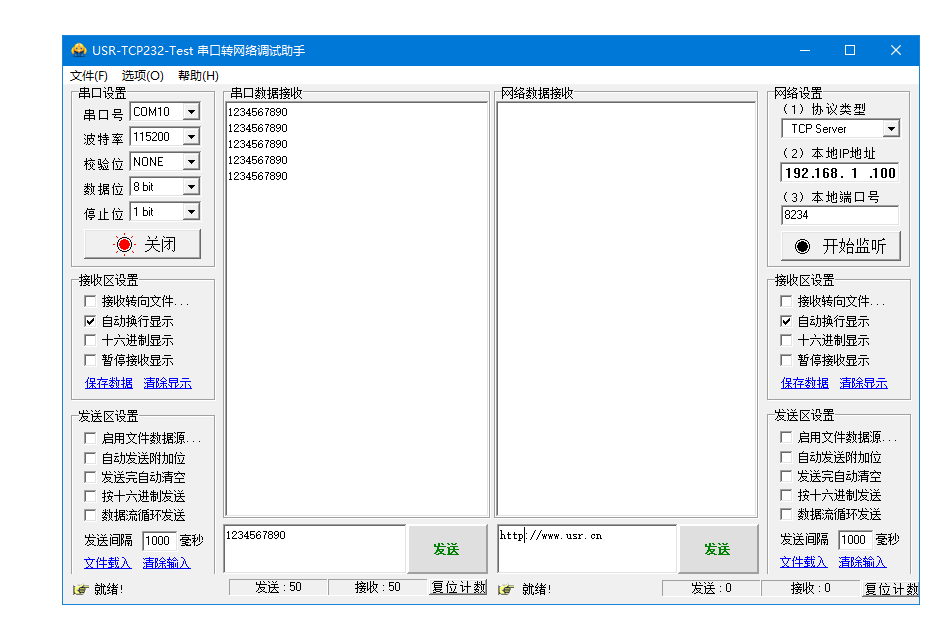 1、打開(kāi)串口助手,選擇USB-RS485串口線的COM口號(hào),串口參數(shù)和USR-G805p一致。測(cè)試串口向有人測(cè)試服務(wù)器發(fā)送數(shù)據(jù),有人測(cè)試服務(wù)器向串口返回同樣數(shù)據(jù)。證明產(chǎn)品聯(lián)網(wǎng)正常,串口通訊正常。
