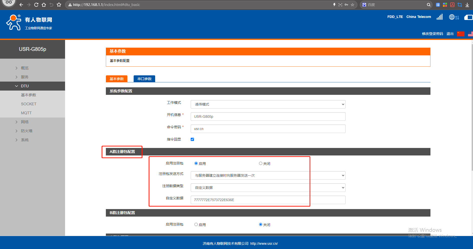 USR-G805p連接遠(yuǎn)程服務(wù)器注冊包功能示例