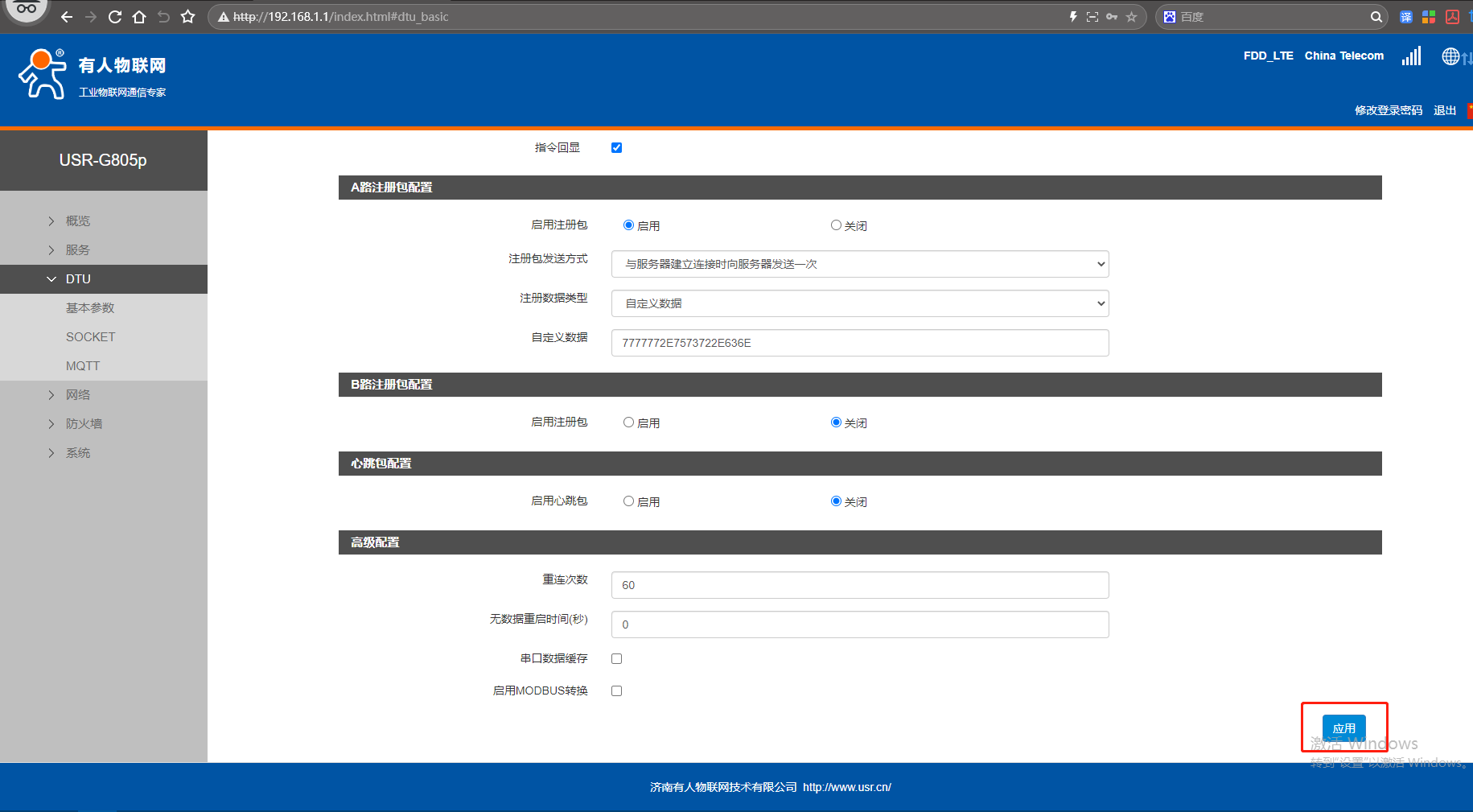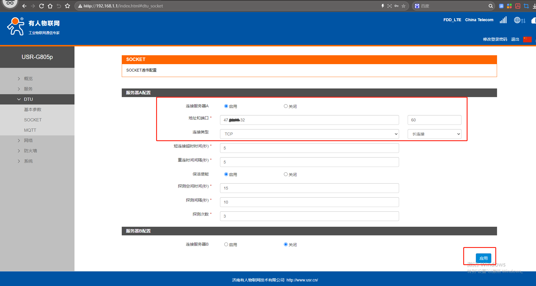 網(wǎng)頁點(diǎn)擊DTU,點(diǎn)擊SOCKET,連接服務(wù)器A,點(diǎn)擊啟用,地址填遠(yuǎn)程服務(wù)器,端口號60,連接類型TCP,長連接。點(diǎn)擊應(yīng)用。