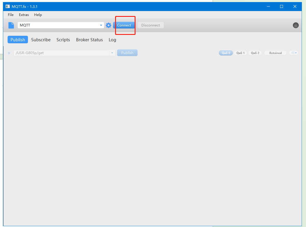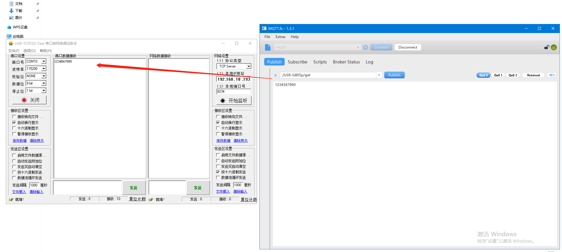 (1)MQTT.fx軟件點(diǎn)擊Publish,輸入/USR-G805p/get,輸入數(shù)據(jù)1234567890,點(diǎn)擊Publish,串口接收到MQTT.fx發(fā)送的數(shù)據(jù)1234567890。