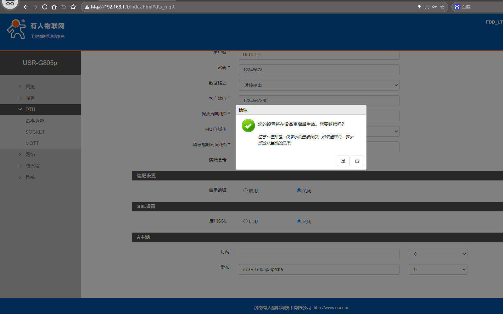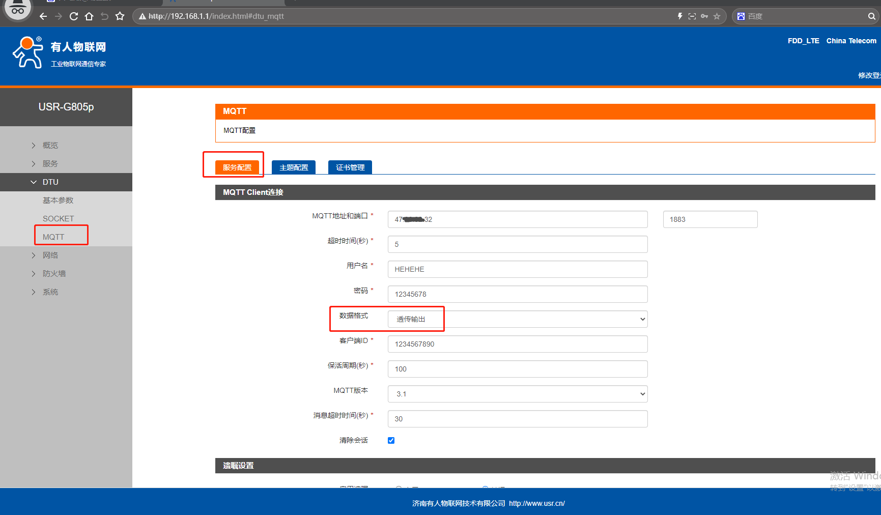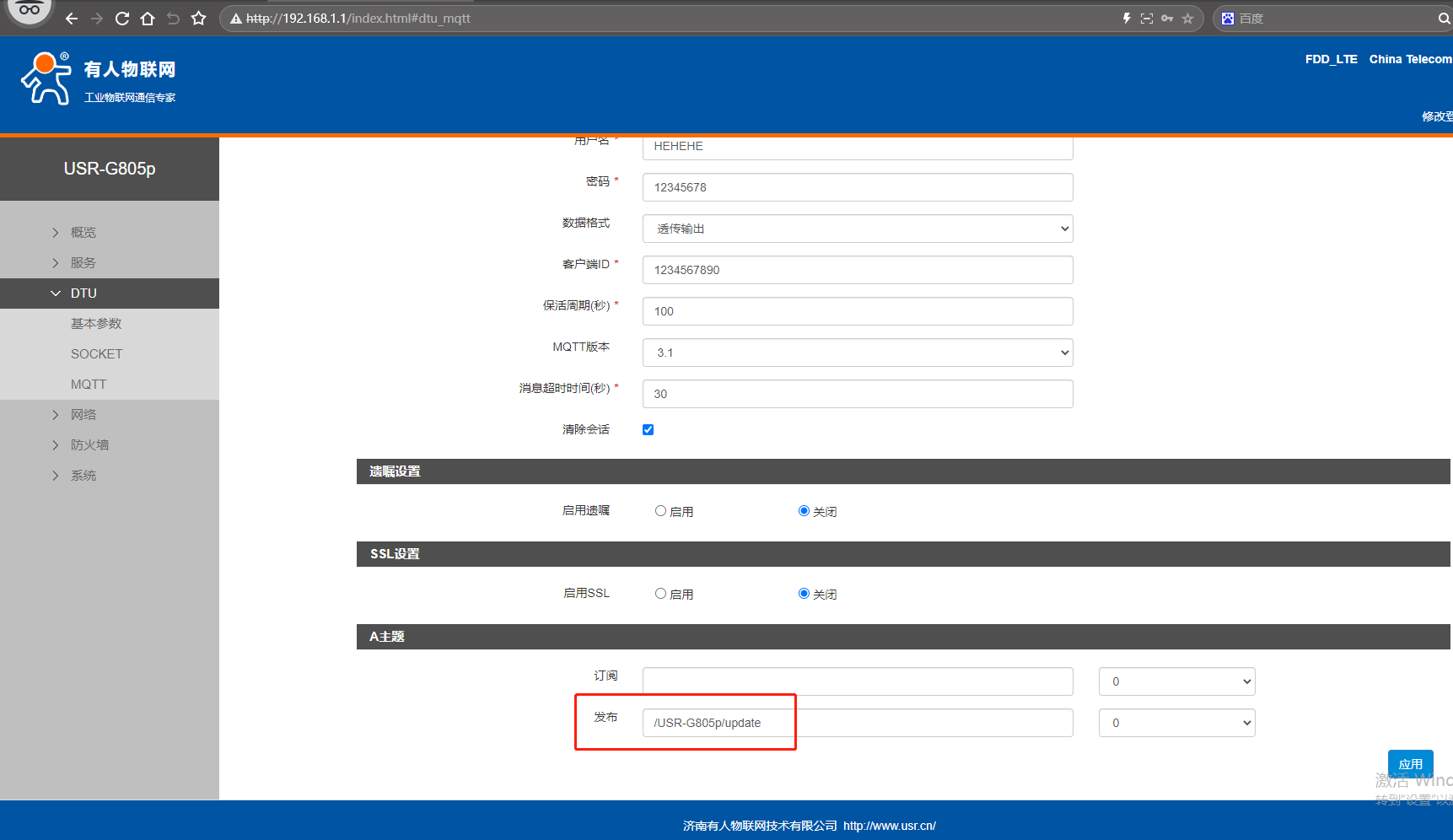 USR-G805p 連接MQTT透?jìng)鬏敵鍪纠?/span>