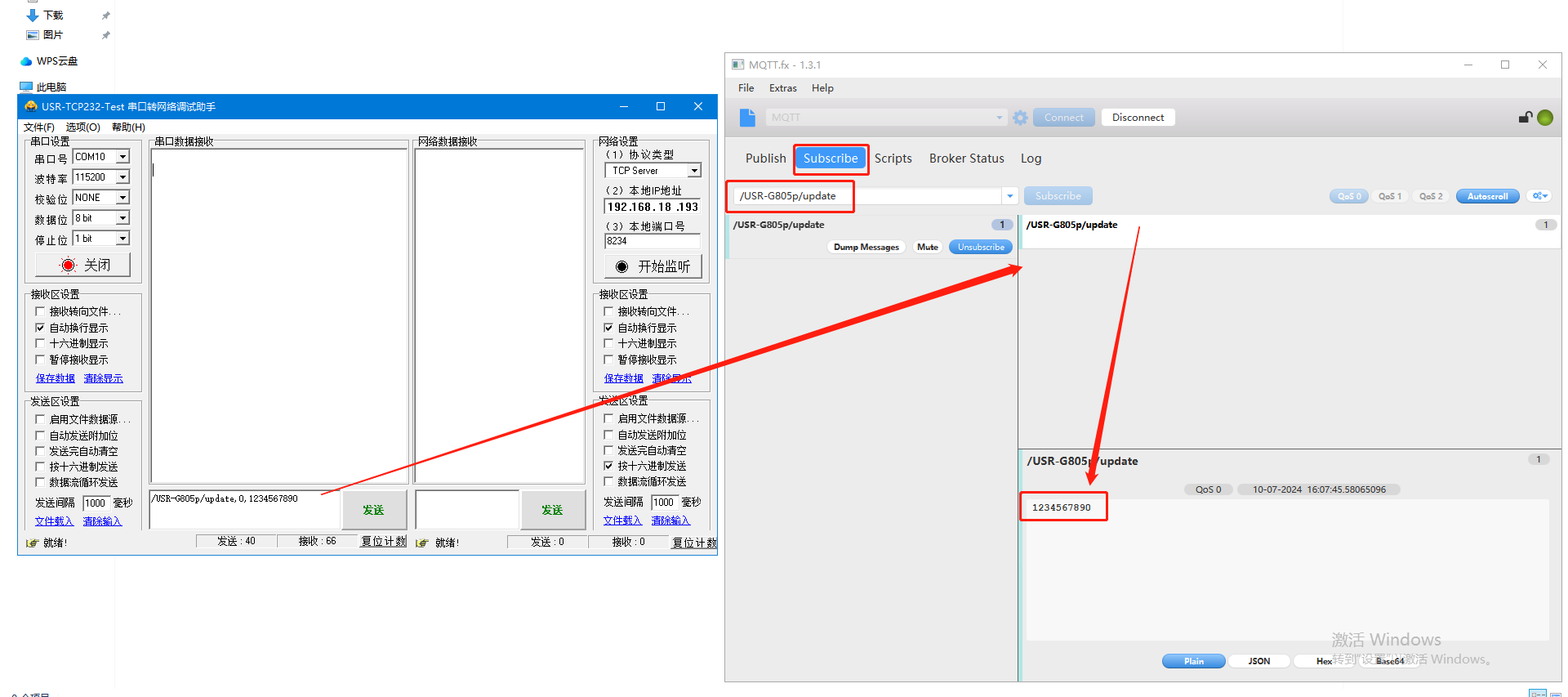 (2)MQTT.fx軟件點(diǎn)擊Subscribe,輸入/USR-G805p/update,點(diǎn)擊后面的Subscribe。串口助手按照格式發(fā)送數(shù)據(jù),/USR-G805p/update,0,1234567890,MQTT.fx軟件接收到數(shù)據(jù)1234567890。
