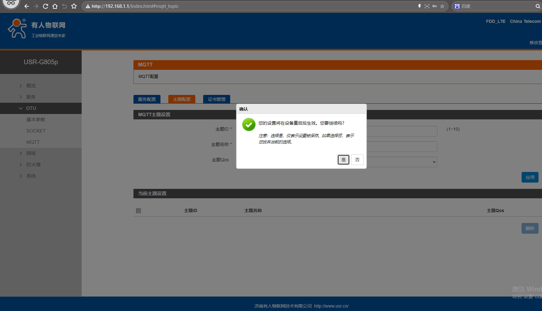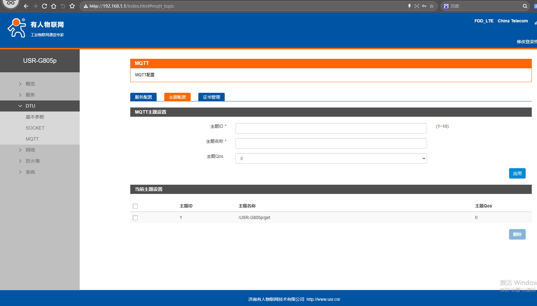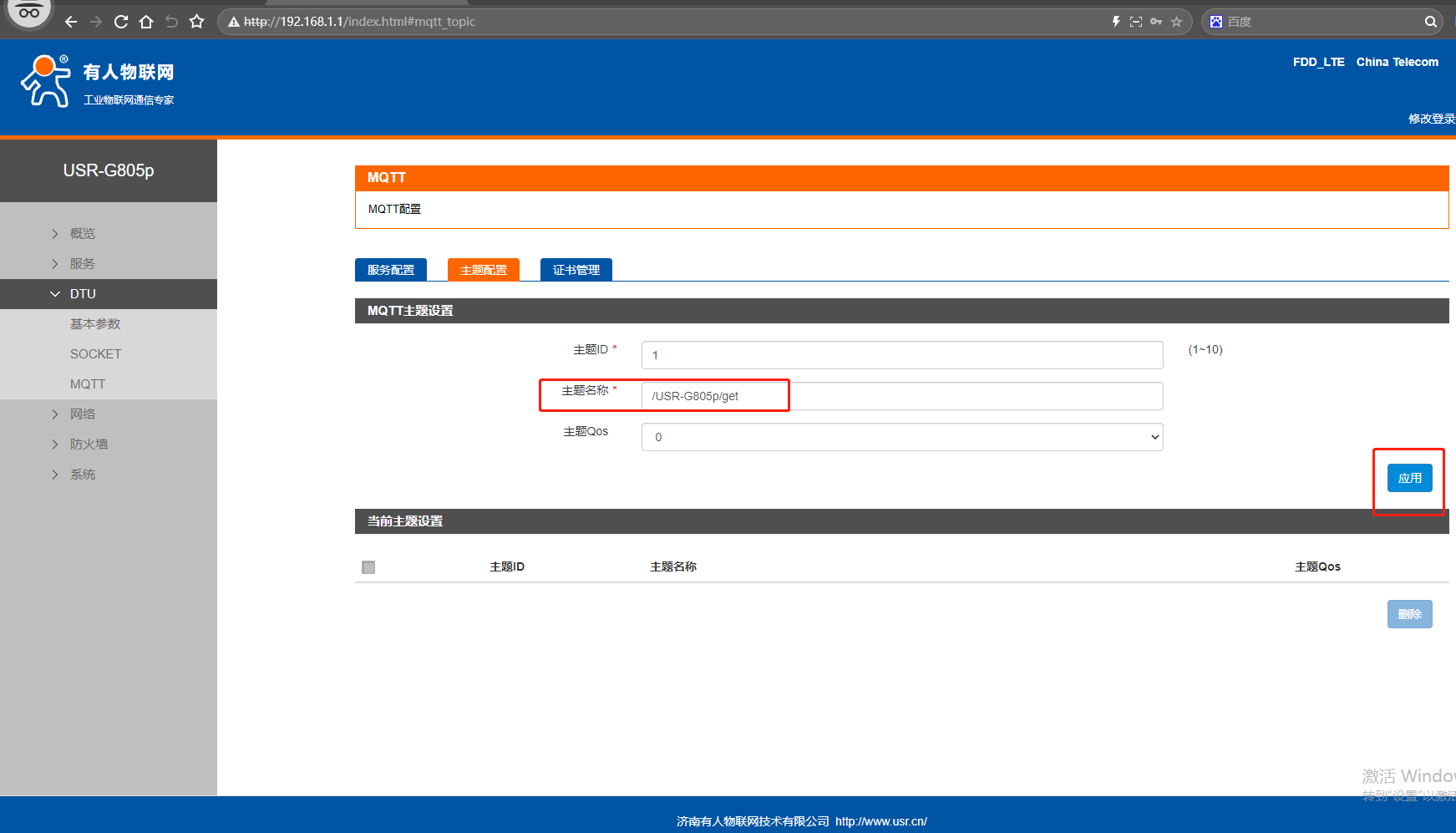 網(wǎng)頁(yè)點(diǎn)擊MQTT,點(diǎn)擊主題配置,主題ID設(shè)置1,主題名稱/USR-G805p/get,主題Qos填0。點(diǎn)擊應(yīng)用。