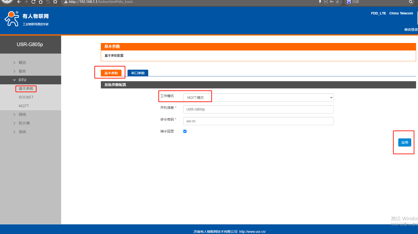 網(wǎng)頁(yè)點(diǎn)擊DTU,點(diǎn)擊基本參數(shù),工作模式選擇MQTT模式。點(diǎn)擊應(yīng)用。