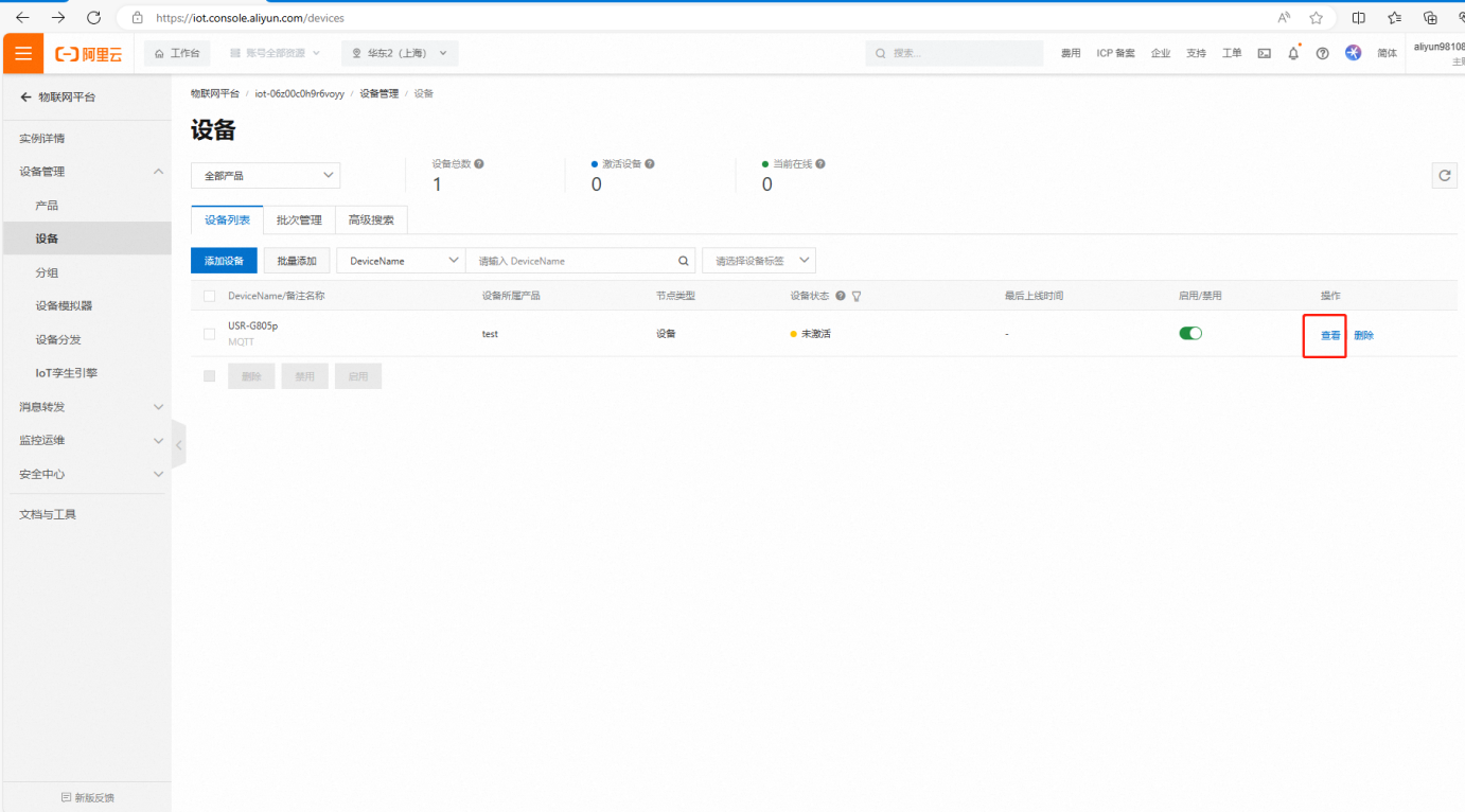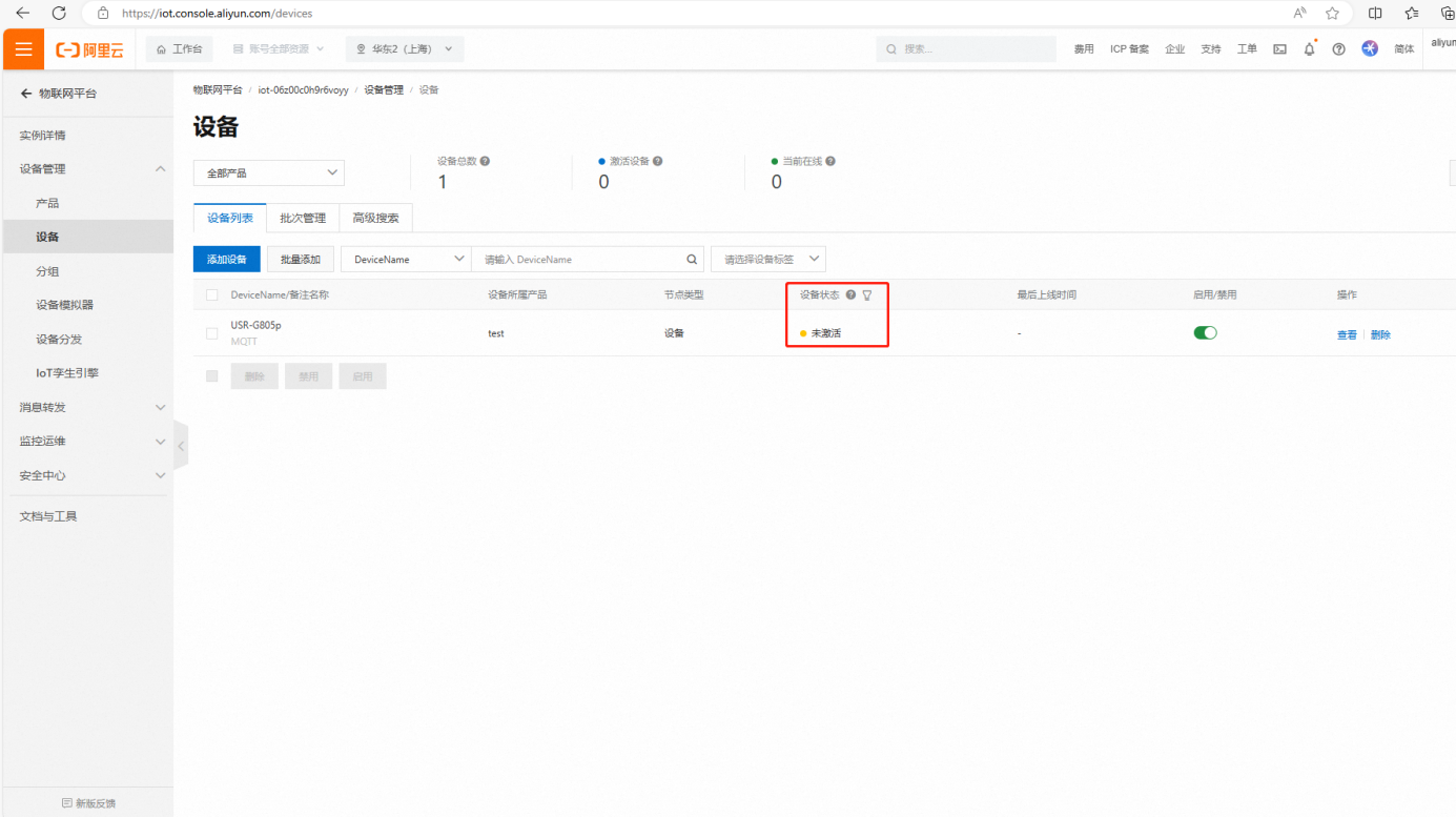 (2)添加完設(shè)備,如下圖展示,設(shè)備狀態(tài)是未激活,等設(shè)置完USR-G805p的MQTT連接阿里云參數(shù)之后,設(shè)備狀態(tài)才顯示在線。