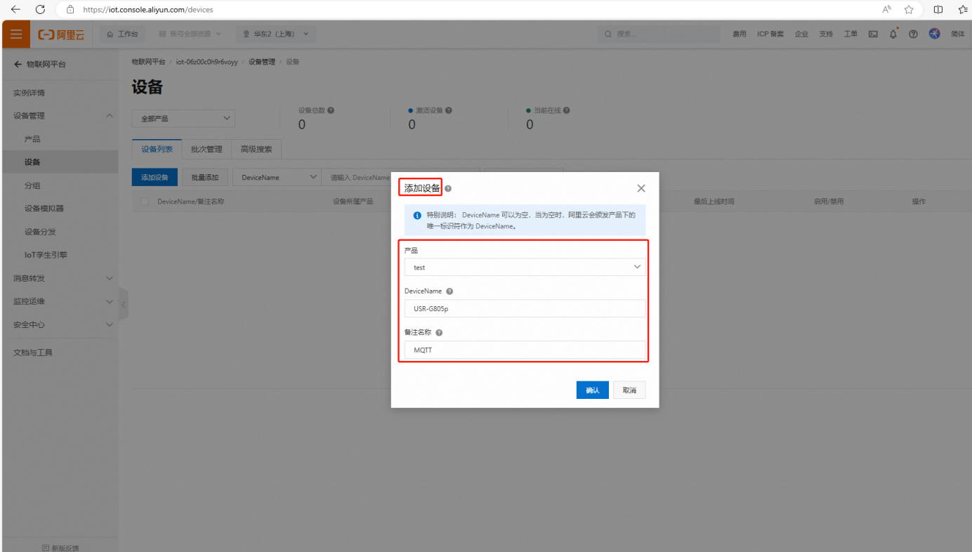 (1)產(chǎn)品創(chuàng)建成功后,添加設(shè)備。點擊設(shè)備,點擊添加設(shè)備,產(chǎn)品名舉例填test,DeviceName填USR-G805p,備注名稱填MQTT,點擊確認。