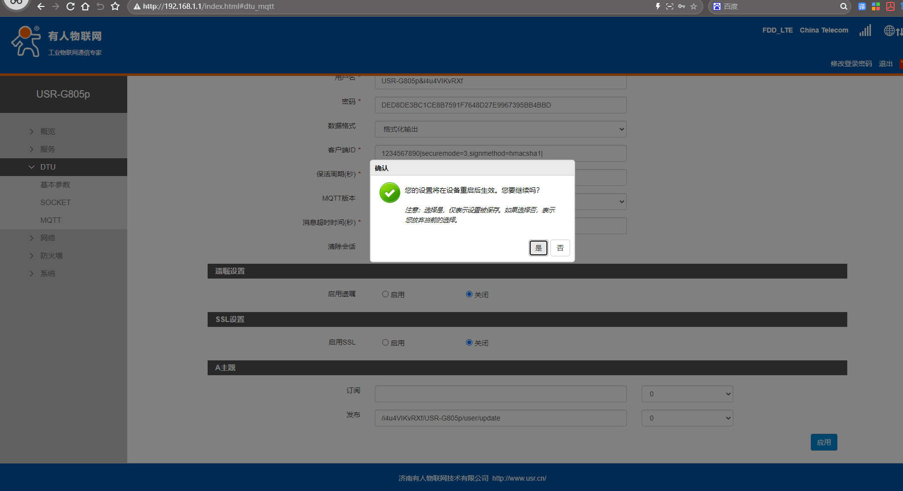 USR-G805p連接阿里云的的密碼:DED8DE3BC1CE8B7591F7648D27E9967395BB4BBD