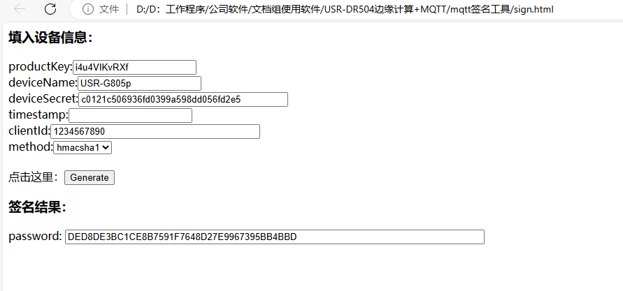 7、使用MQTT簽名工具,生成USR-G805p連接阿里云的密碼