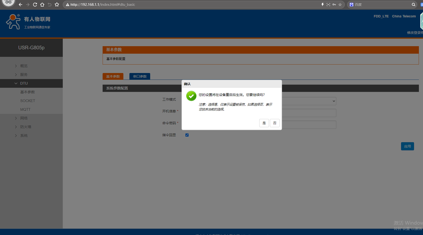 網(wǎng)頁點擊DTU,點擊基本參數(shù),工作模式選擇MQTT模式。點擊應(yīng)用。