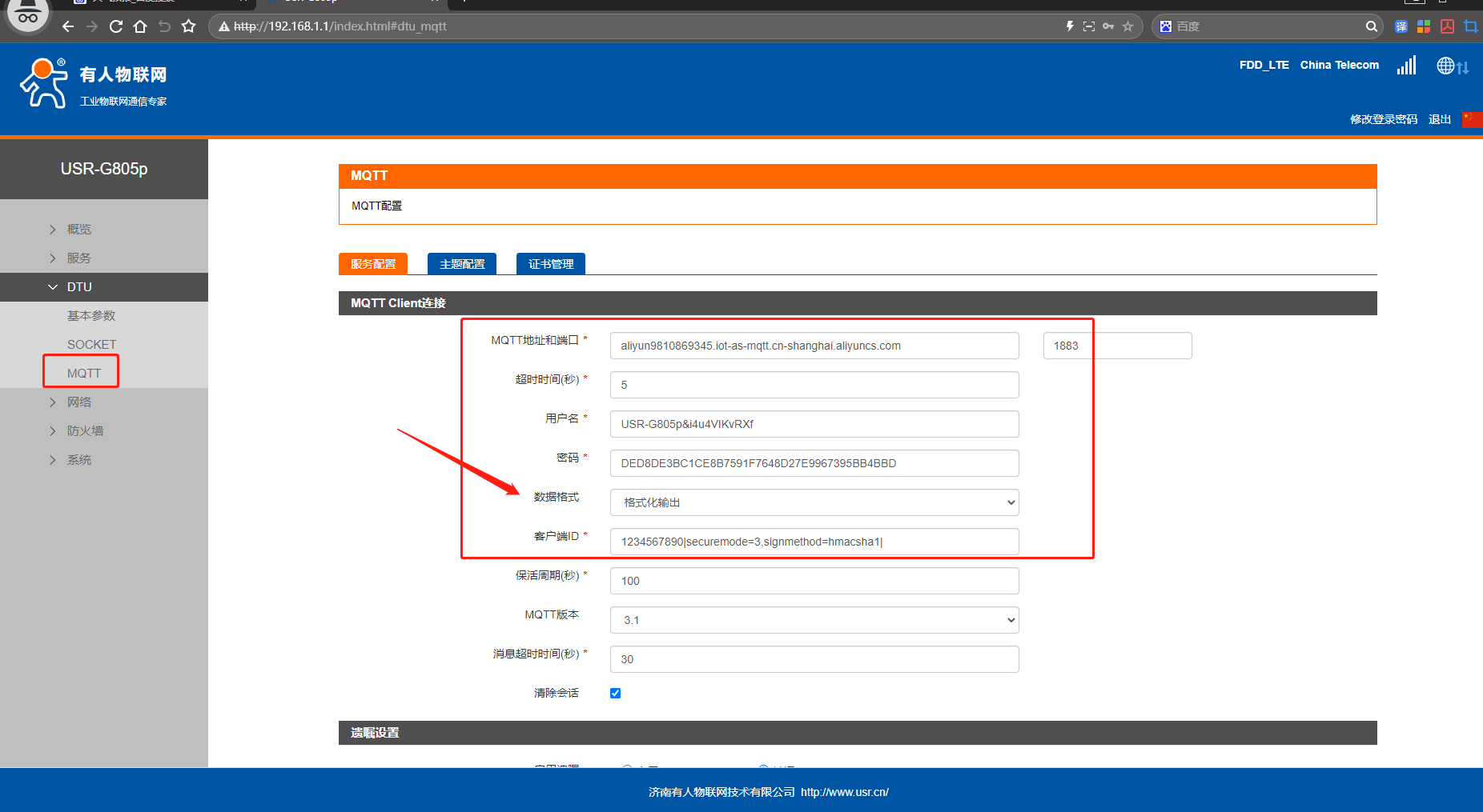 USR-G805p MQTT連接阿里云格式化輸出示例