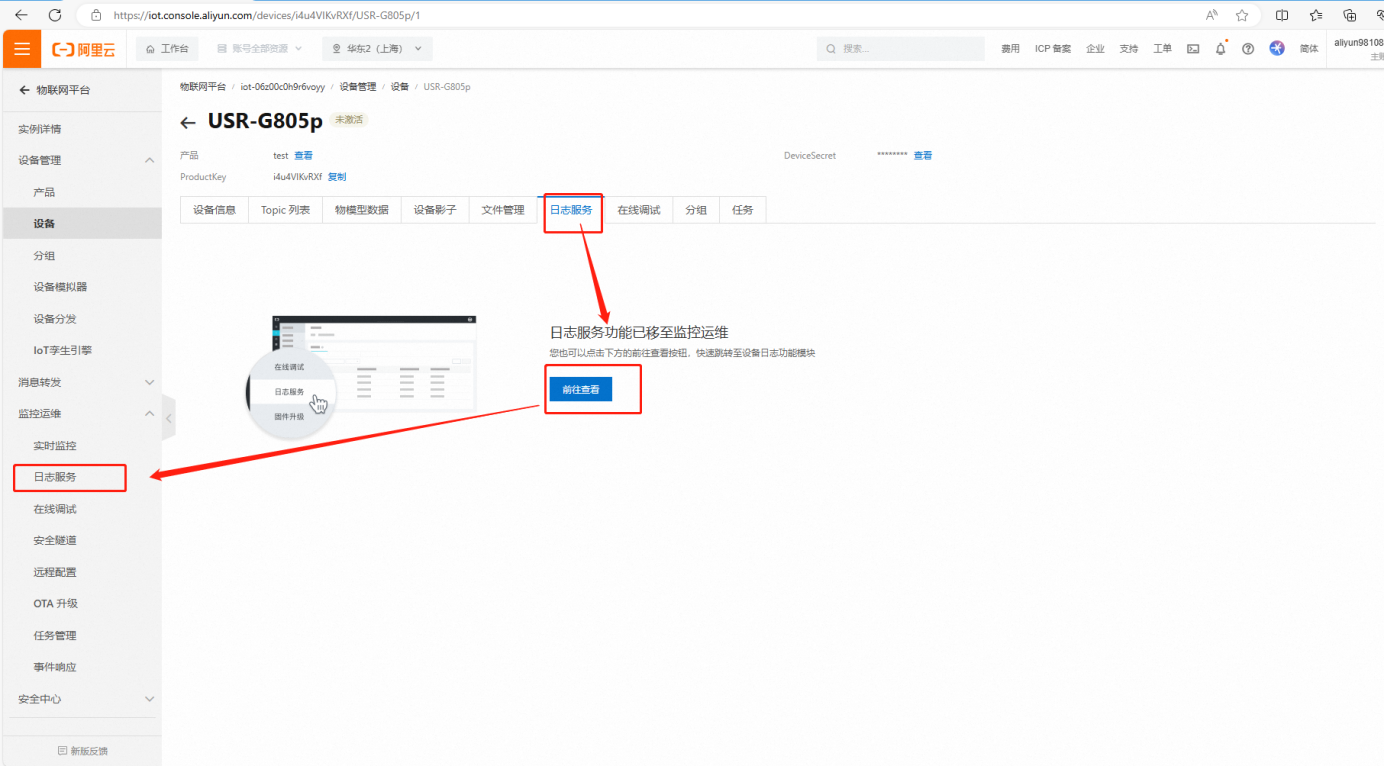 (1)點擊設(shè)備,點擊日志服務(wù)