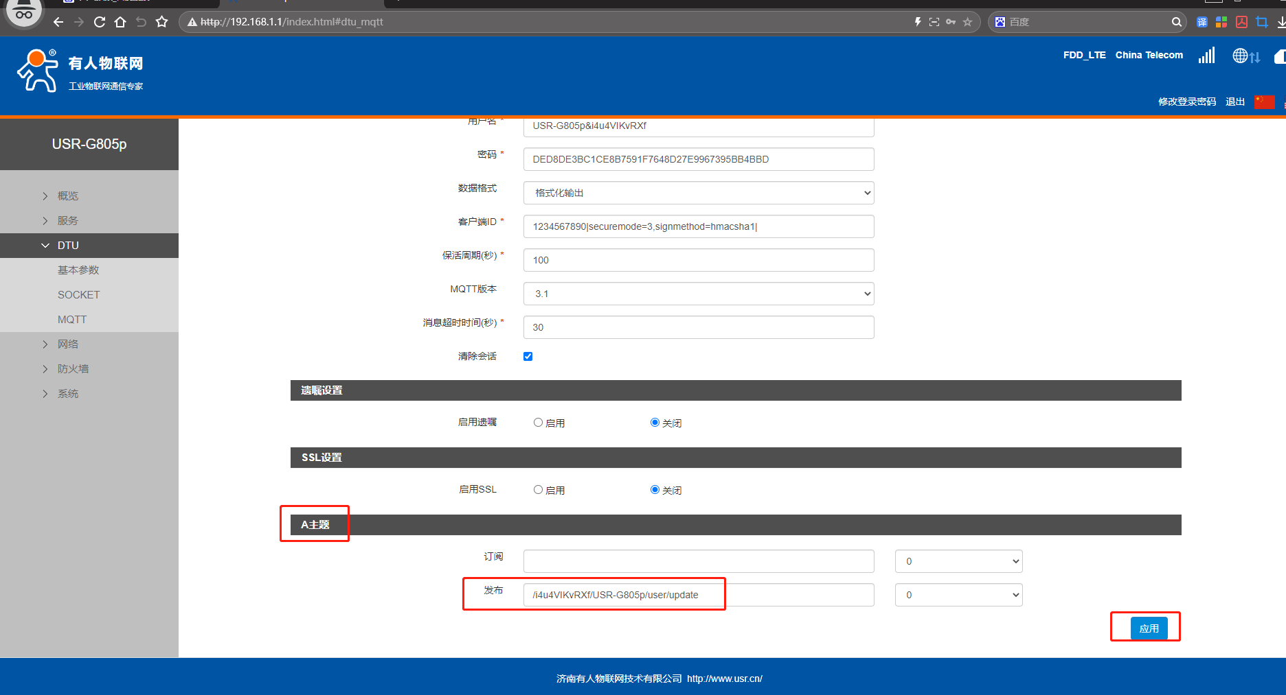(2)A主題,發(fā)布填寫/i4u4VIKvRXf/USR-G805p/user/update。