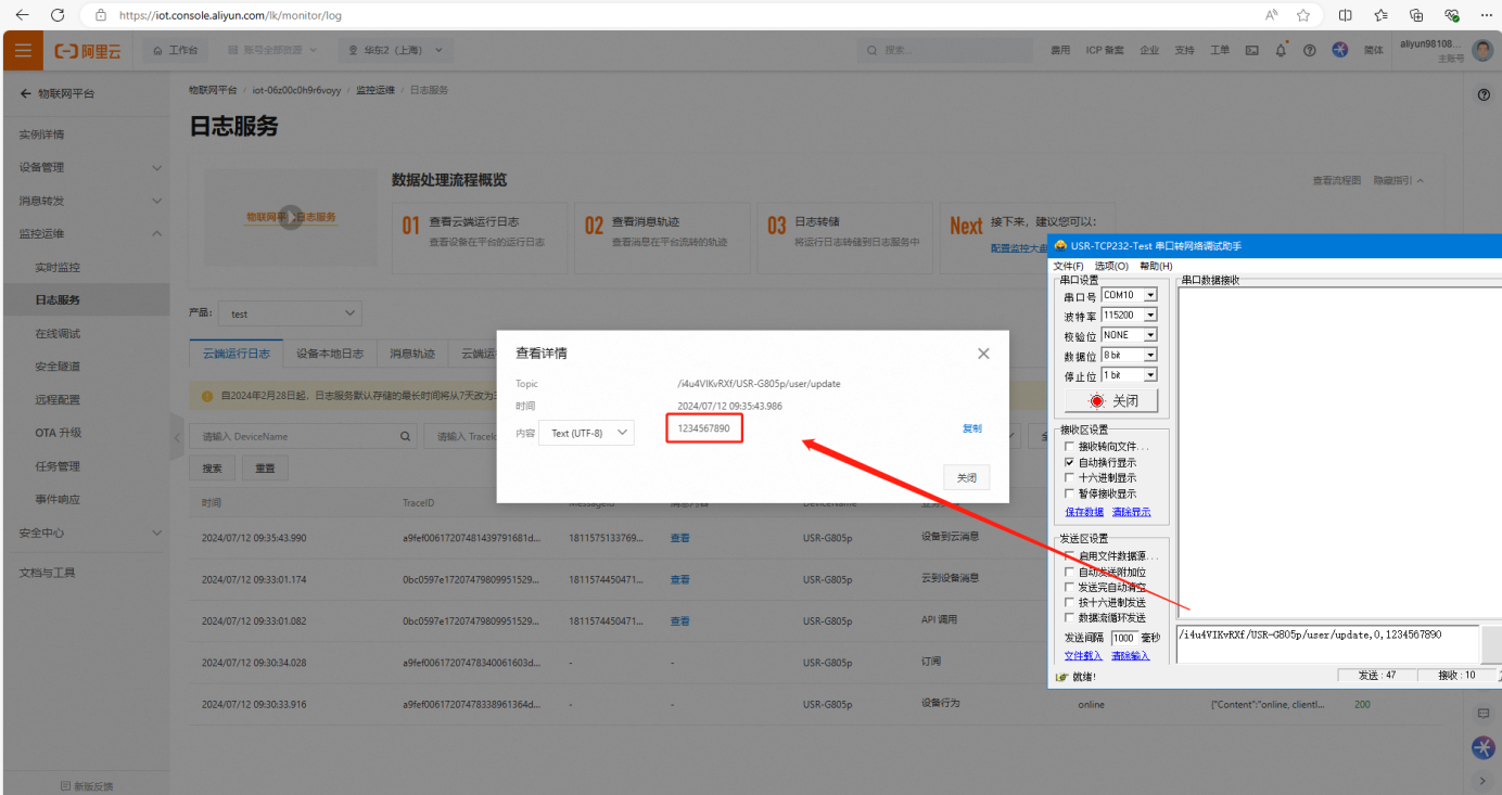 (3)USR-G805p使用串口助手發(fā)送數(shù)據(jù)/i4u4VIKvRXf/USR-G805p/user/update,0,1234567890,發(fā)送完成之后,我們在阿里云平臺可以通過日志服務(wù),點擊查看,看到USR-G805p串口發(fā)到阿里云的數(shù)據(jù)1234567890。