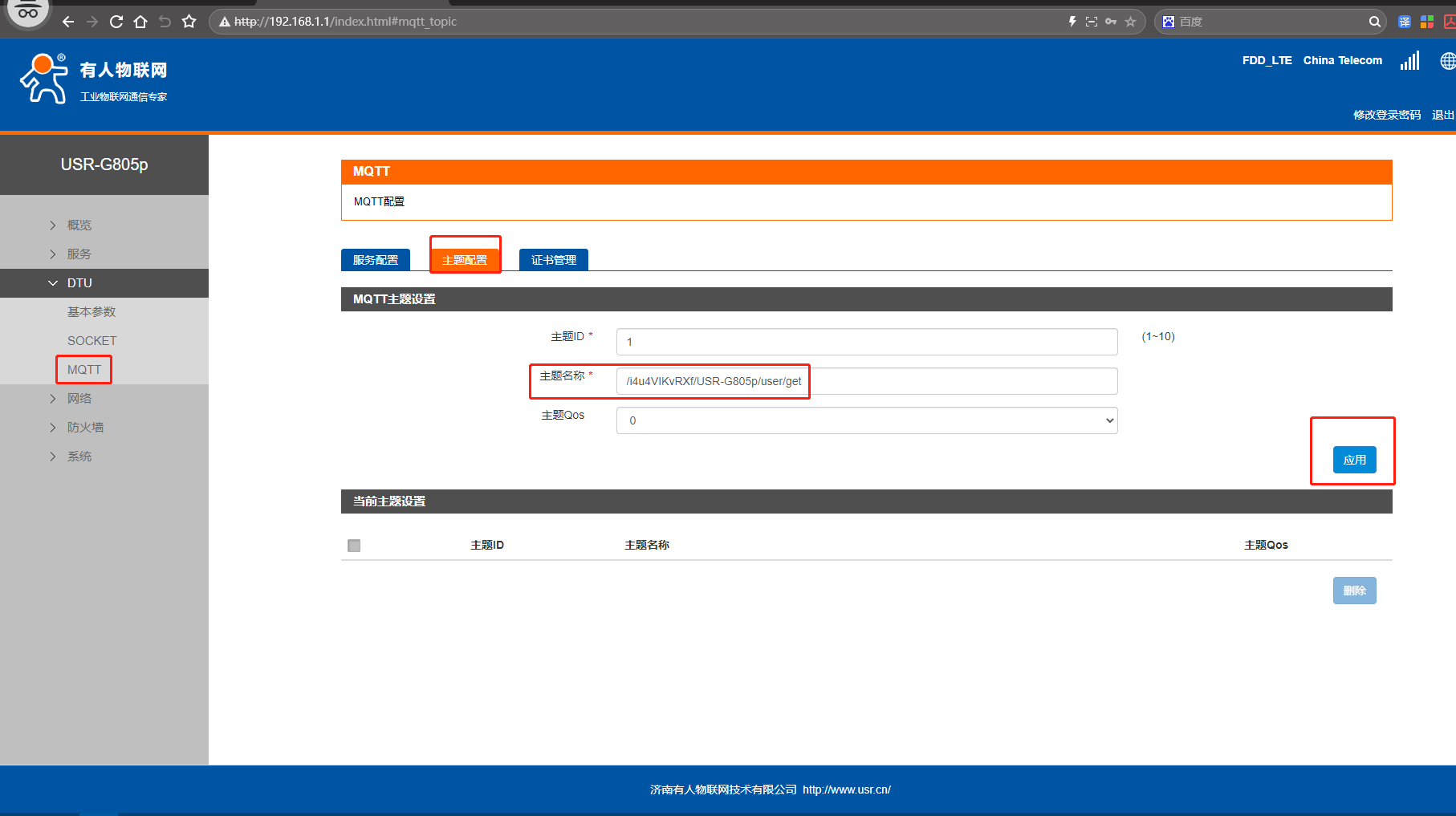 網(wǎng)頁點擊MQTT,點擊主題配置,主題ID設(shè)置1,主題名稱/i4u4VIKvRXf/USR-G805p/user/get,主題Qos填0。點擊應(yīng)用。