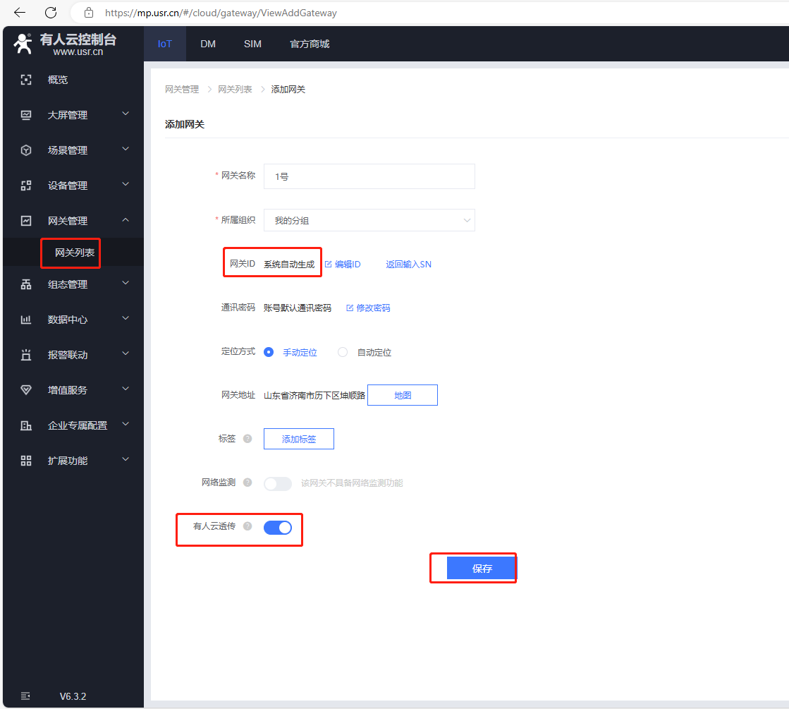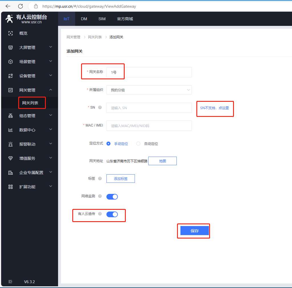 (2)選擇不支持SN上云,就點(diǎn)擊SN不支持,點(diǎn)這里,用自動(dòng)生成的ID方式上云,在有人云上添加設(shè)備,勾選有人云透?jìng)鳌?/p>