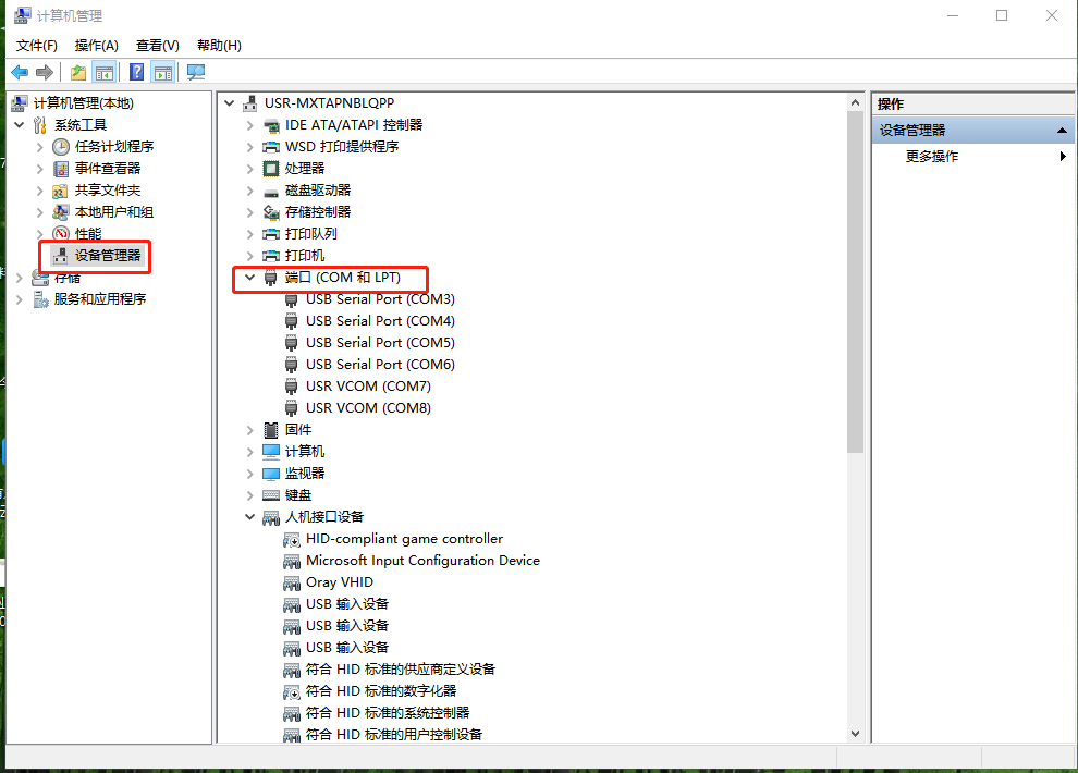 電腦鼠標(biāo)點(diǎn)擊計(jì)算機(jī)管理,右擊,點(diǎn)開(kāi)設(shè)備管理器,點(diǎn)擊端口,查看接USR的USB-RS232串口線COM口號(hào)。