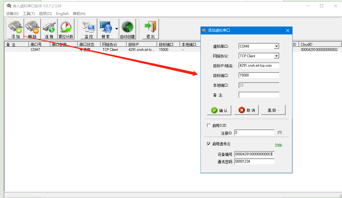 高級(jí)設(shè)置開(kāi)啟透?jìng)髟疲斎胗腥嗽铺砑釉O(shè)備的編號(hào)ID 00004291000000000003和密碼00001234,點(diǎn)擊確認(rèn)。
