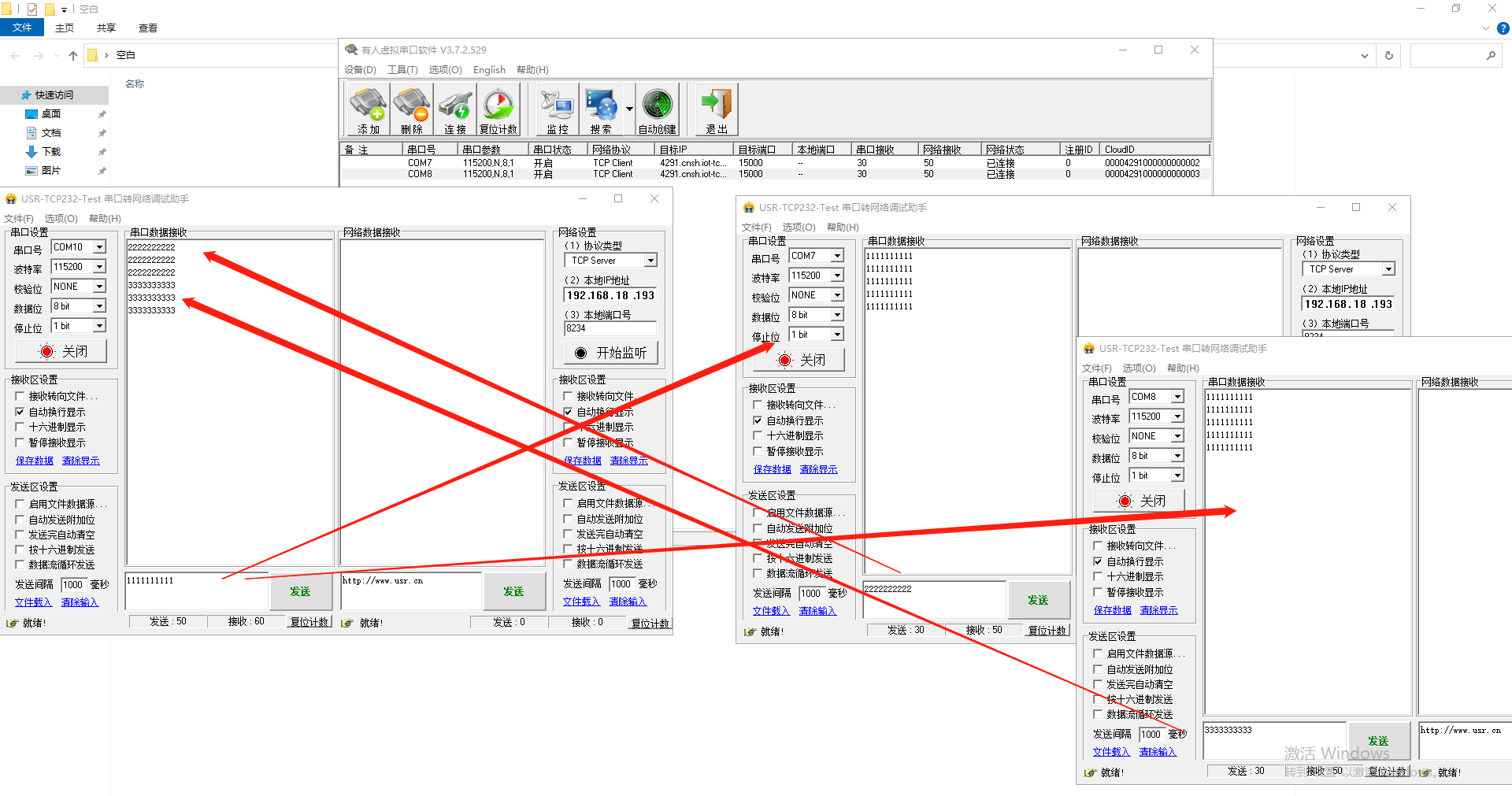 打開(kāi)3個(gè)串口助手,分別用有人產(chǎn)品實(shí)際USB串口COM10打開(kāi)串口,另外2個(gè)串口助手用虛擬串口COM7、COM8打開(kāi)串口。
