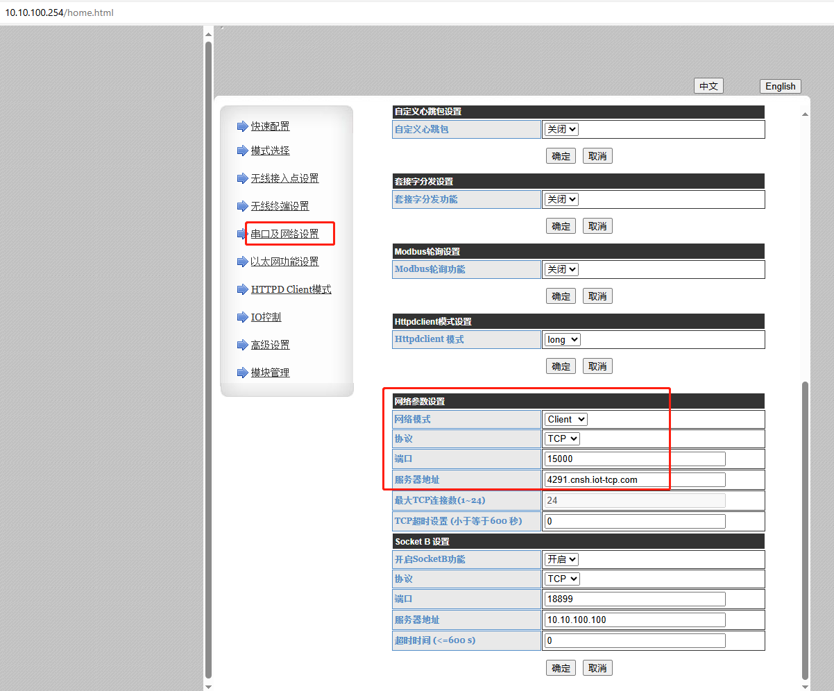 網(wǎng)絡(luò)參數(shù)模式CLient,協(xié)議TCP,端口15000,服務(wù)器地址填4291.cnsh.iot-tcp.com。