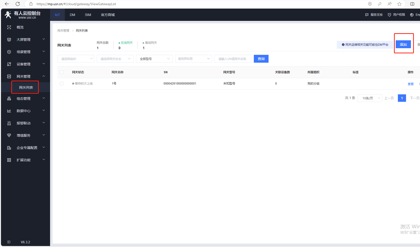 2、選擇邊緣端網(wǎng)關(guān),添加的USR產(chǎn)品1號(hào)設(shè)備