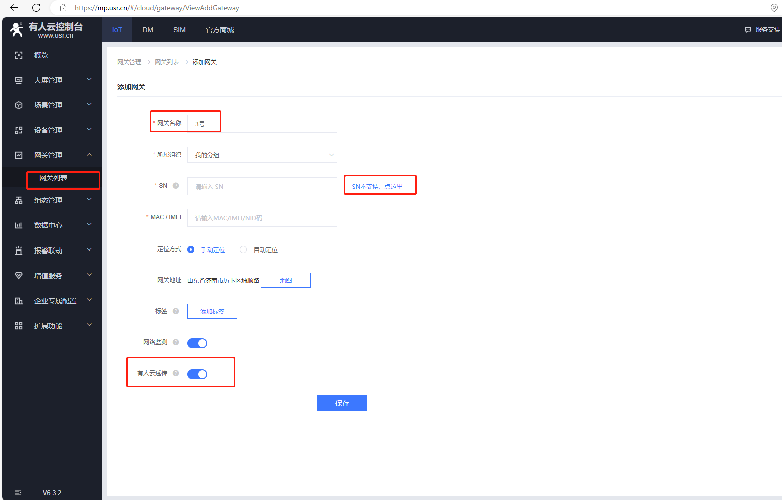 2、USR-VCOM虛擬串口添加,點(diǎn)擊SN不支持,點(diǎn)這里,用自動(dòng)生成的ID方式上云,在有人云上添加設(shè)備,勾選有人云透?jìng)鳌?/p>