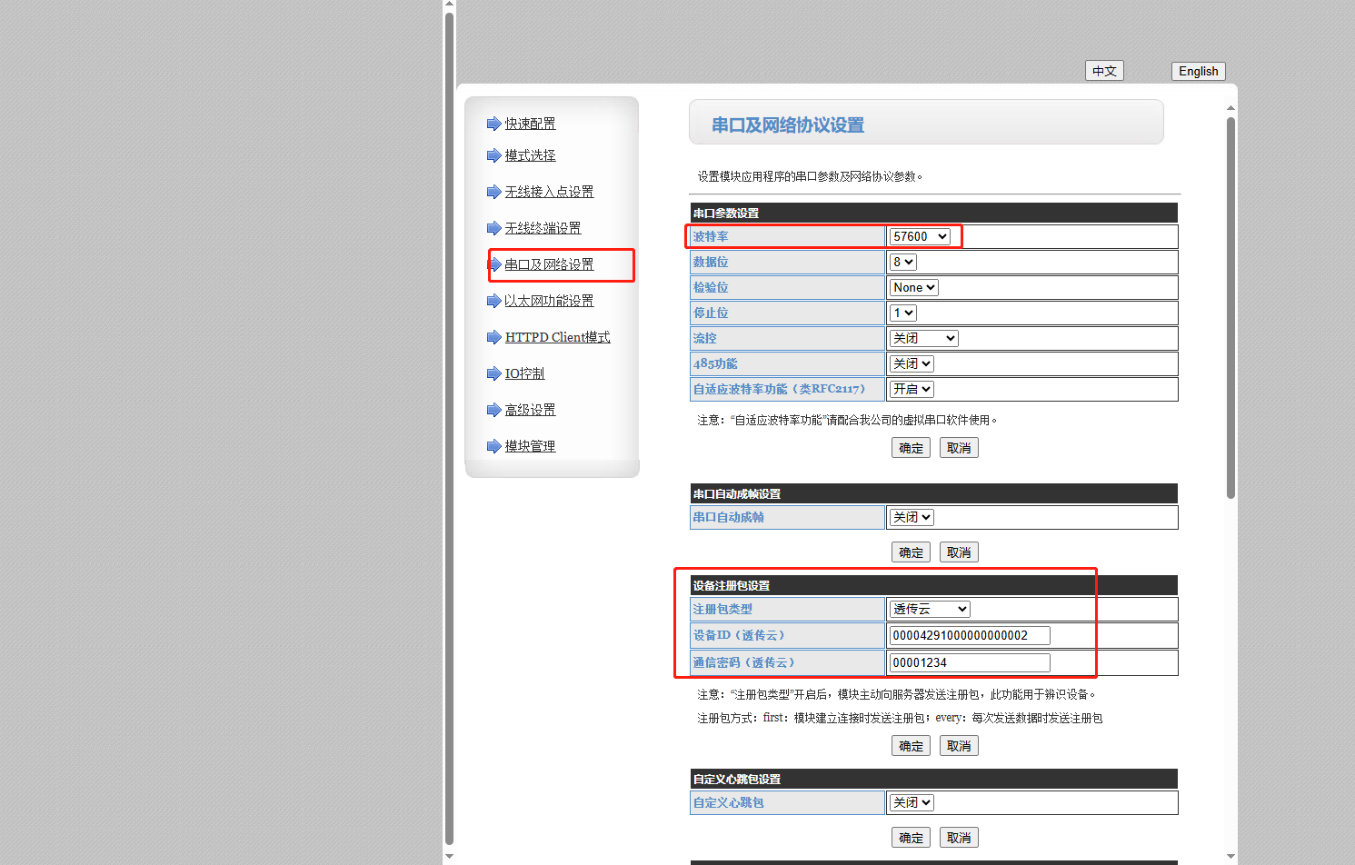 開啟注冊包,選擇透傳云,設(shè)備ID填添加有人云的ID 00004291000000000002,通信密碼填00001234,點(diǎn)擊確定。