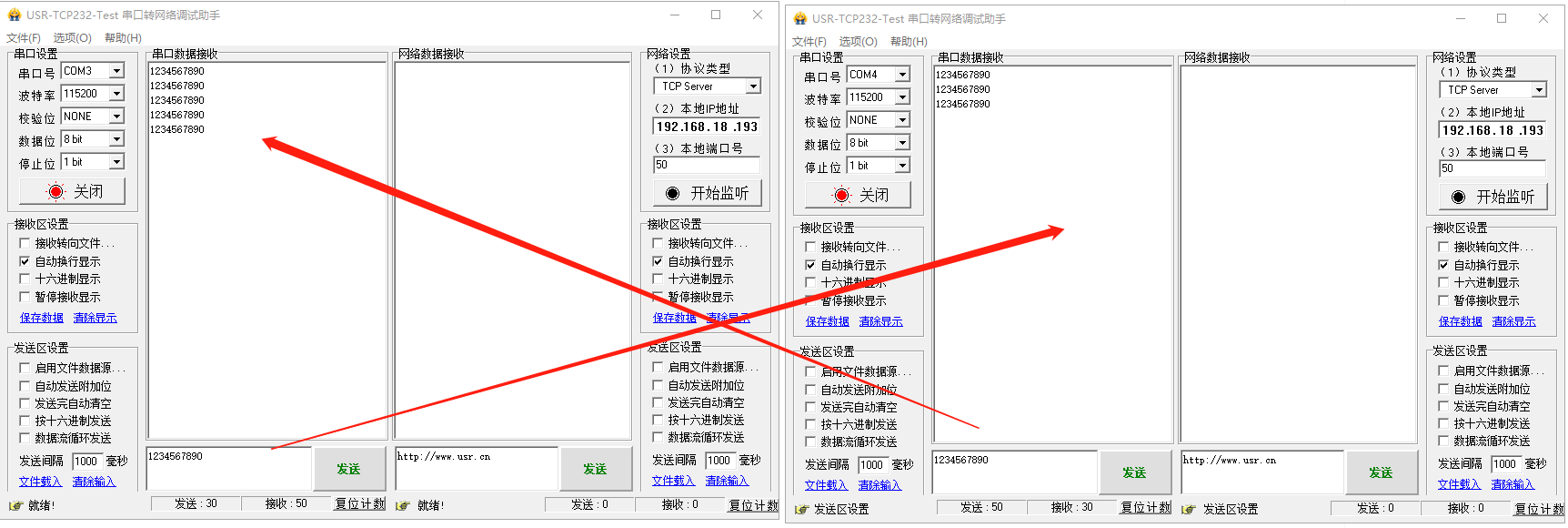 2、測試實(shí)際2個USR-WIFI232-B2的串口之間數(shù)據(jù)通訊。