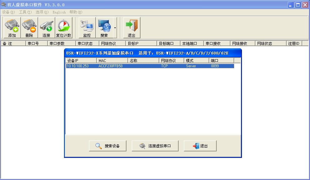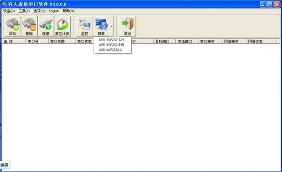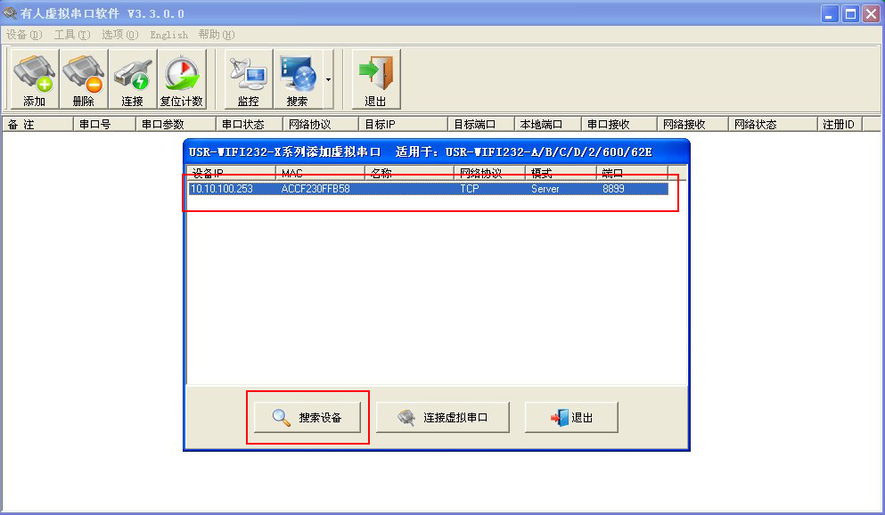 打開有人虛擬串口軟件USR-VCOM,點(diǎn)擊搜索,選擇“USR-WIFI232-XX”系列產(chǎn)品
