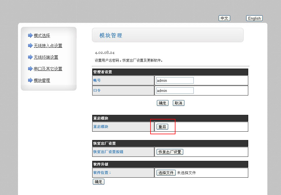 進(jìn)入“模塊管理”界面,點(diǎn)擊“重啟”,使設(shè)置生效。