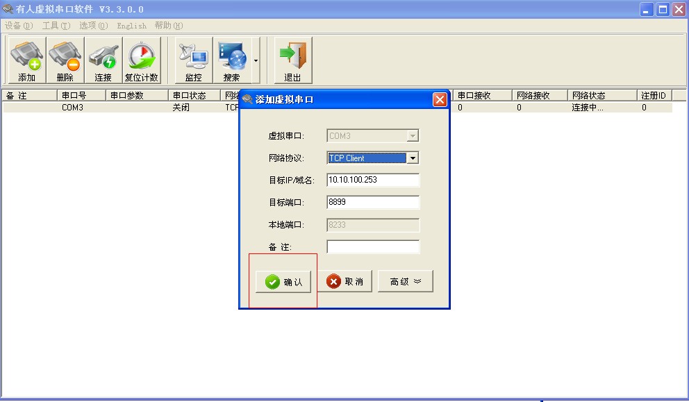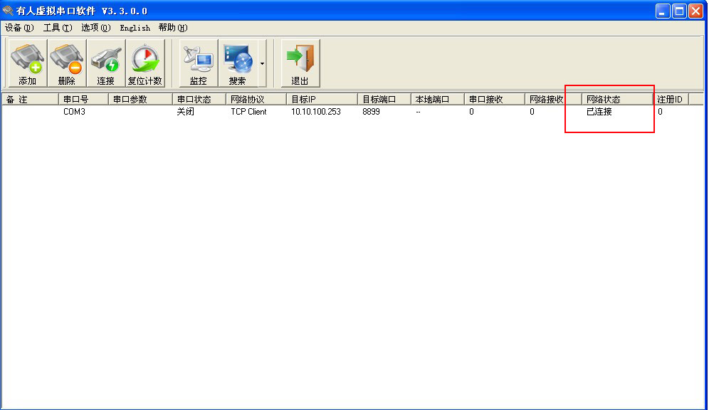 6.此時虛擬串口建立完畢,查看網(wǎng)絡(luò)狀態(tài)為已連接,則證明網(wǎng)絡(luò)通信已成功。如果網(wǎng)絡(luò)狀態(tài)為監(jiān)聽或連接失敗,擇注意計算機(jī)上是否有雙網(wǎng)卡,禁用掉不用的網(wǎng)卡。查看是否開啟了WINDOWS防火墻,關(guān)閉防火墻。