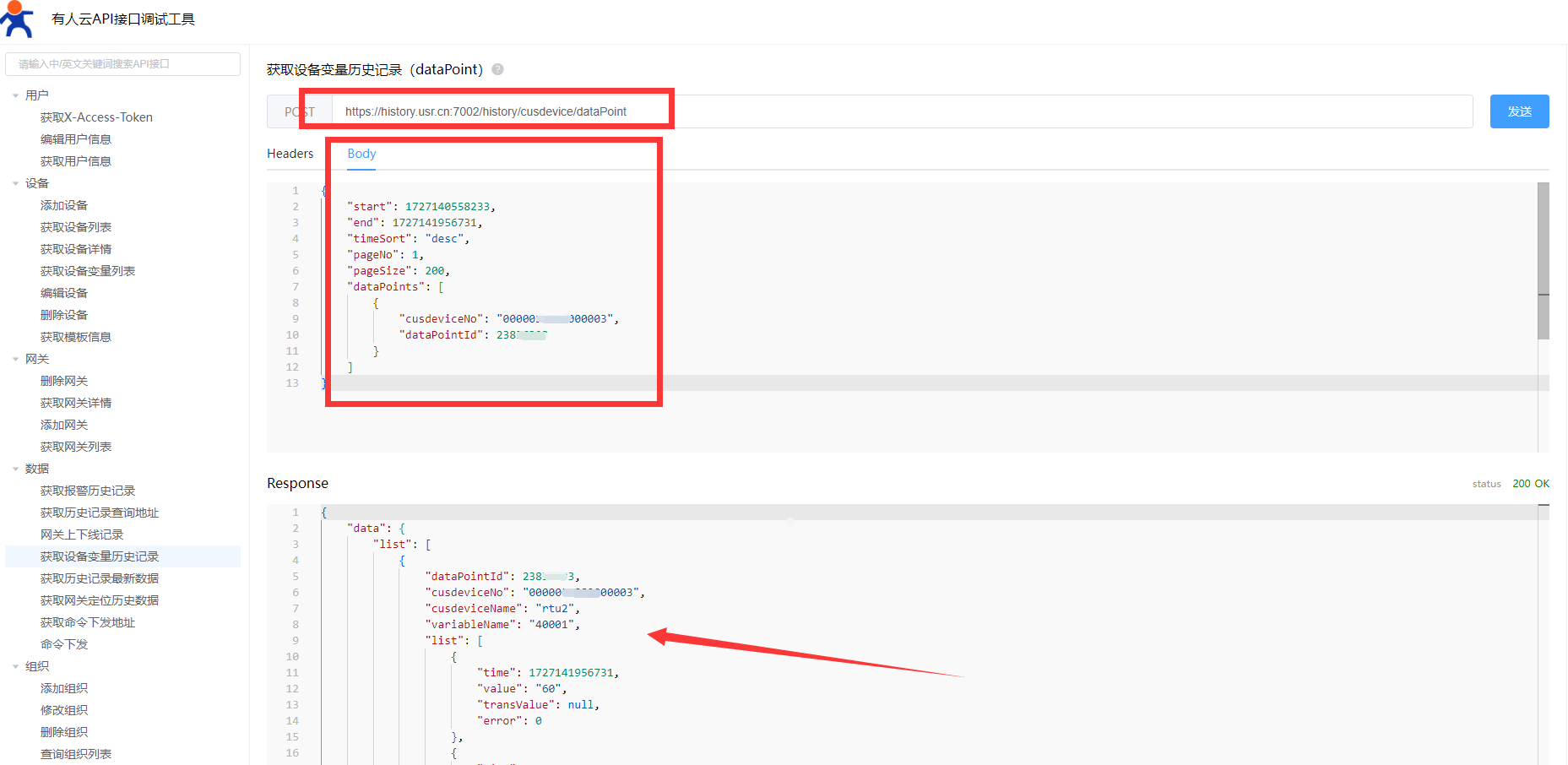 C、將說明文檔中示例粘入body,具體參數(shù)需要替換為自己的實(shí)際參數(shù),可在平臺查看,發(fā)送后獲取到查詢時(shí)間段內(nèi)的歷史數(shù)據(jù)(時(shí)間戳格式為unix時(shí)間戳ms)