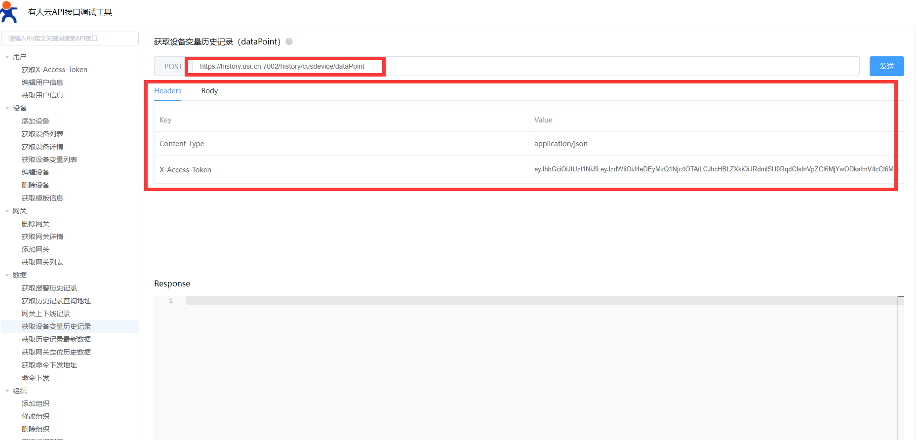 A、將{url}/history/cusdevice/dataPoint中{url}的替換為前一步獲取的查詢地址,組成獲取設(shè)備變量歷史記錄的URL:https://history.usr......./history/cusdevice/dataPoint
