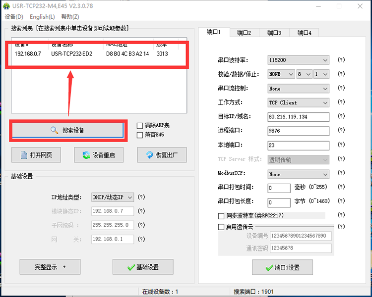 2、打開參數(shù)設(shè)置軟件USR-TCP232-M4,E45-V2.3.0.78.exe (下載地址:http://helipaomo.cn/Download/90.html),點(diǎn)擊“搜索設(shè)備”,點(diǎn)擊搜索到的模塊IP,如圖