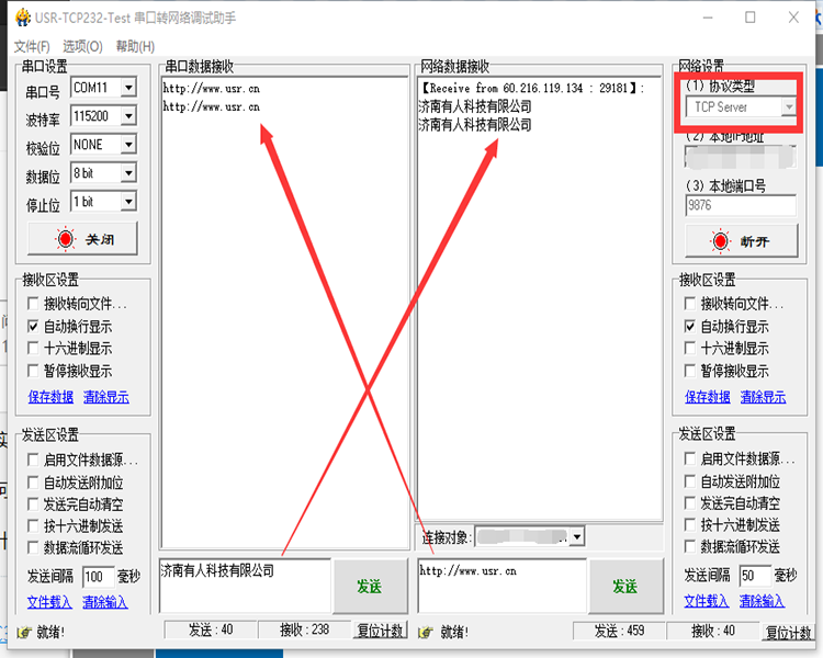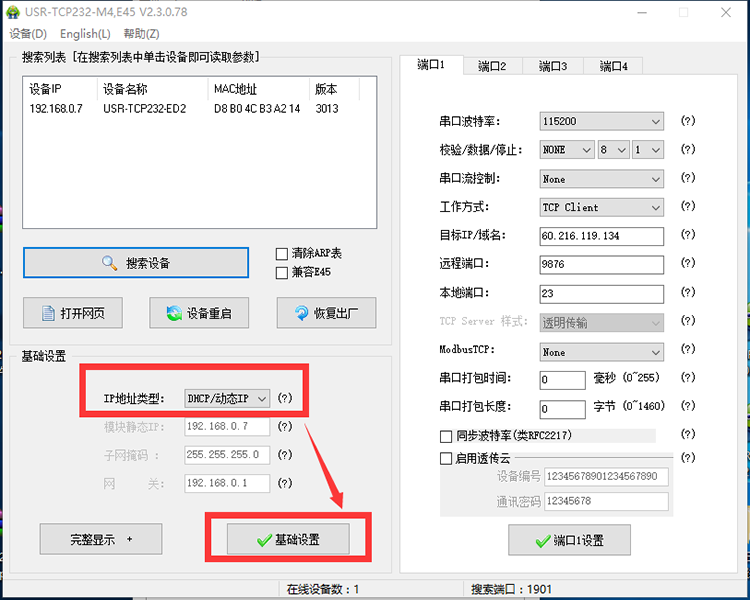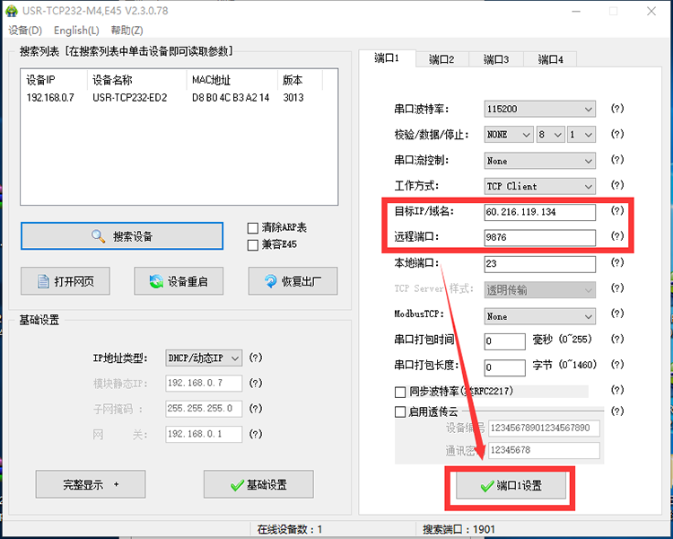 5、打開參數(shù)設(shè)置軟件USR-TCP232-M4,E45-V2.3.0.78.exe ,點(diǎn)擊“搜索設(shè)備”,點(diǎn)擊搜索到的模塊IP,選擇是通過RS485串口還是RS232串口進(jìn)行通信,此處以RS232串口舉例,配置參數(shù)如圖,點(diǎn)擊“端口1設(shè)置”