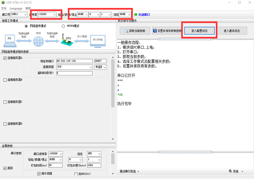 1、將G780模塊插入sim卡,串口連接電腦,打開參數(shù)設(shè)置軟件(下載地址http://helipaomo.cn/Download/415.html),模塊默認串口參數(shù)是115200,N,8,1。點擊“進入配置狀態(tài)”,如圖