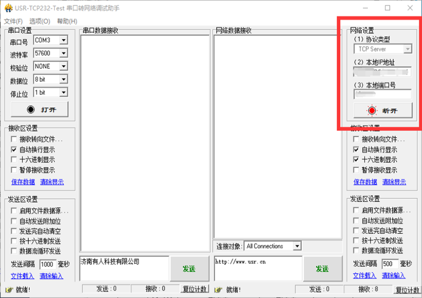 4、重啟后,在串口發(fā)送區(qū)發(fā)送數(shù)據(jù),此時在服務(wù)器上可以接收到串口發(fā)送的數(shù)據(jù),如圖