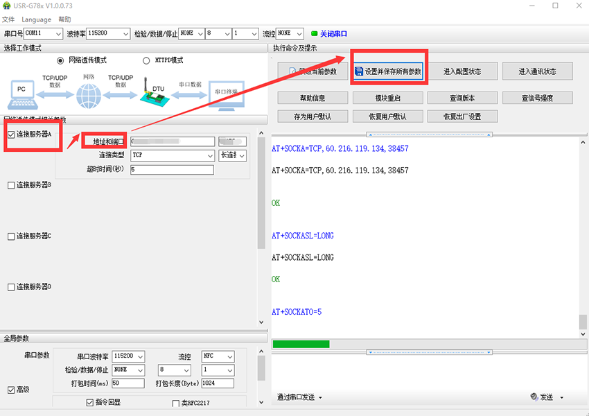 3、勾選連接服務(wù)器A,地址設(shè)置為公網(wǎng)服務(wù)器的公網(wǎng)IP,端口號為服務(wù)器上上位機軟件的端口號。點擊“設(shè)置并保存所有參數(shù)”,如圖