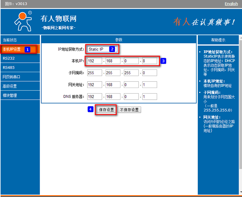 點(diǎn)擊“本機(jī)IP設(shè)置”,將模塊的IP地址設(shè)置為“Static IP”,設(shè)置IP地址為能上網(wǎng)的路由分配的地址或直接改為“DHCP”動態(tài)分配,點(diǎn)擊“保存設(shè)置”。